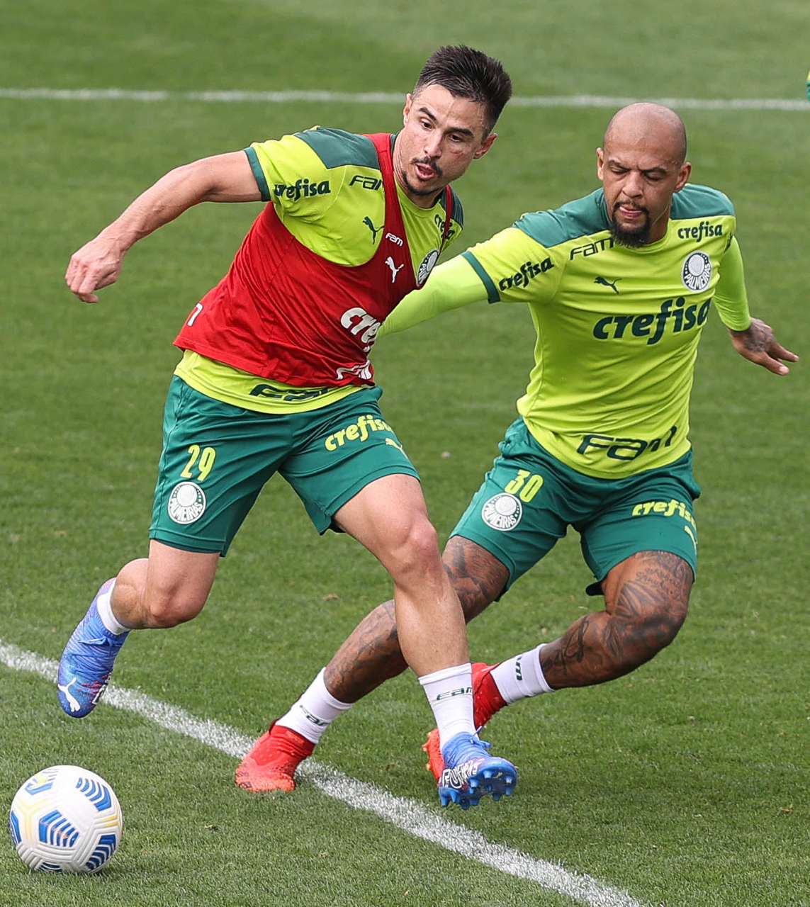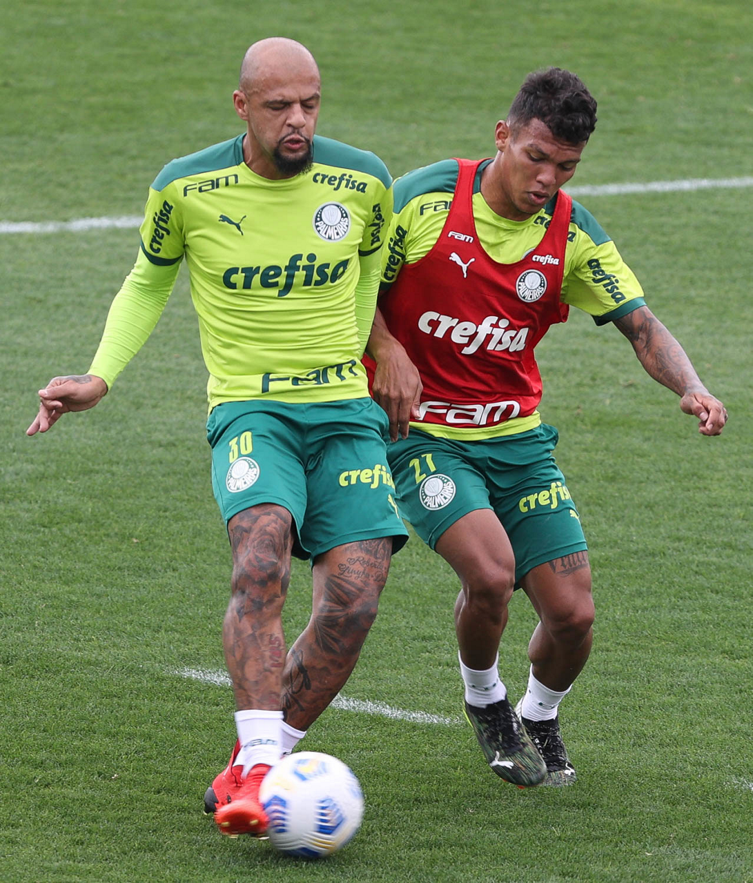 Os jogadores Felipe Melo e Gabriel Veron (D), da SE Palmeiras, durante treinamento, na Academia de Futebol. (Foto: Cesar Greco)