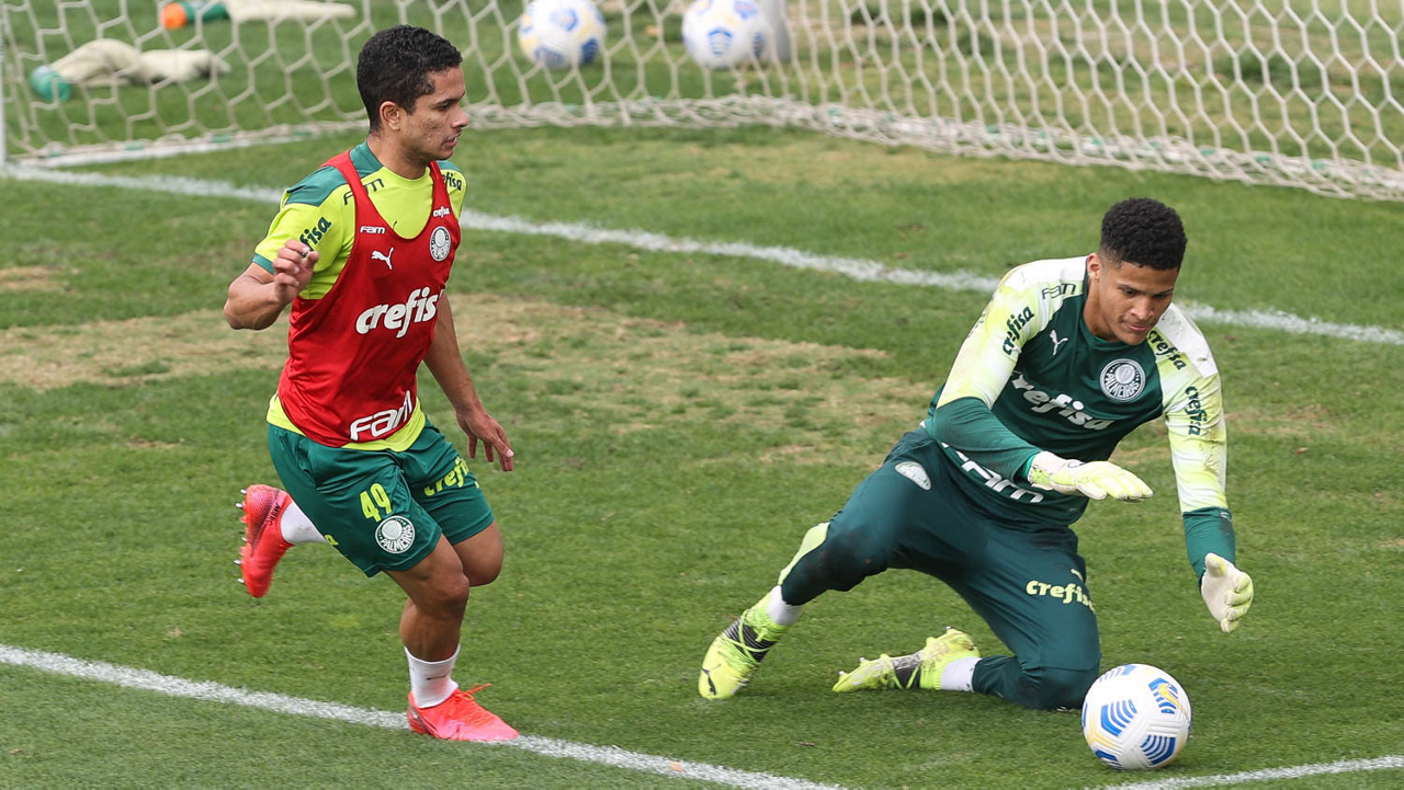 O jogador Gabriel Silva e o goleiro Mateus (D), da SE Palmeiras, durante treinamento, na Academia de Futebol. (Foto: Cesar Greco)