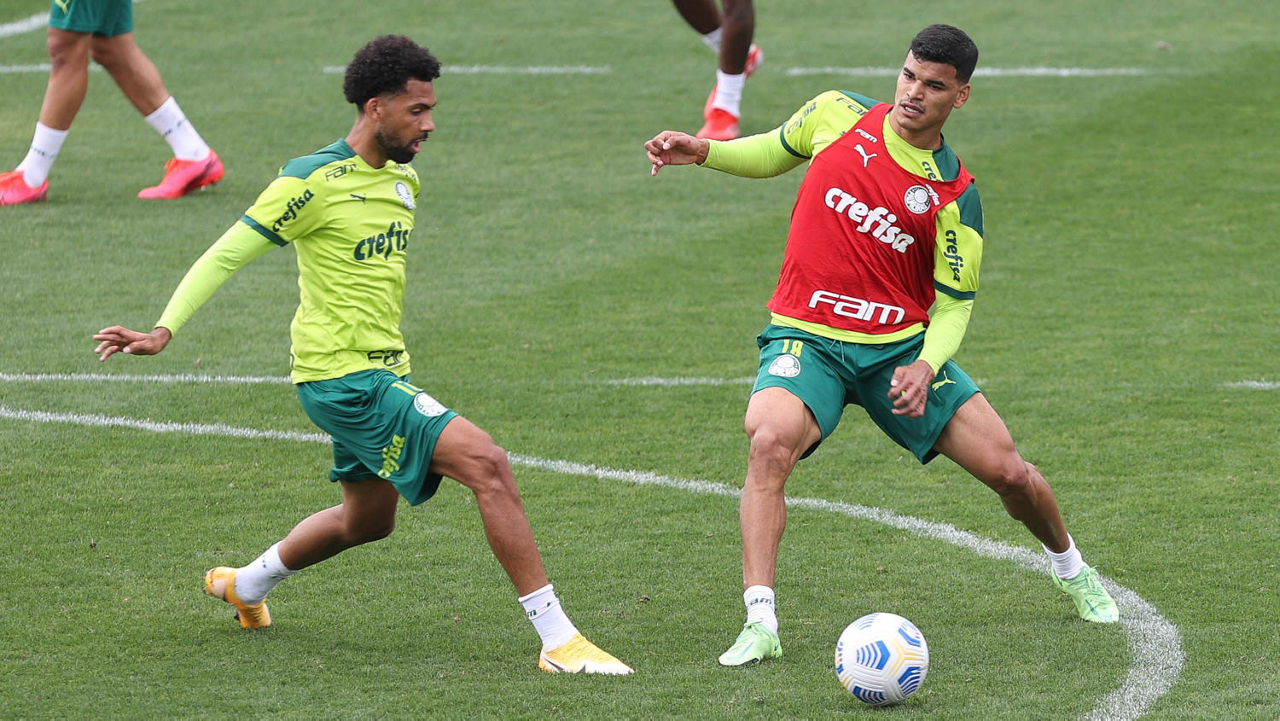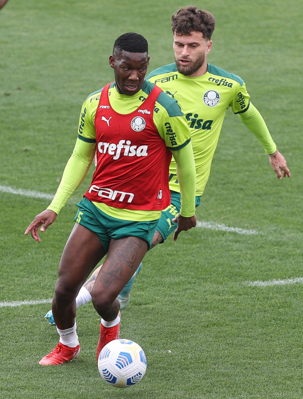 Os jogadores Jhonatan e Benjamín Kuscevic (D), da SE Palmeiras, durante treinamento, na Academia de Futebol. (Foto: Cesar Greco)