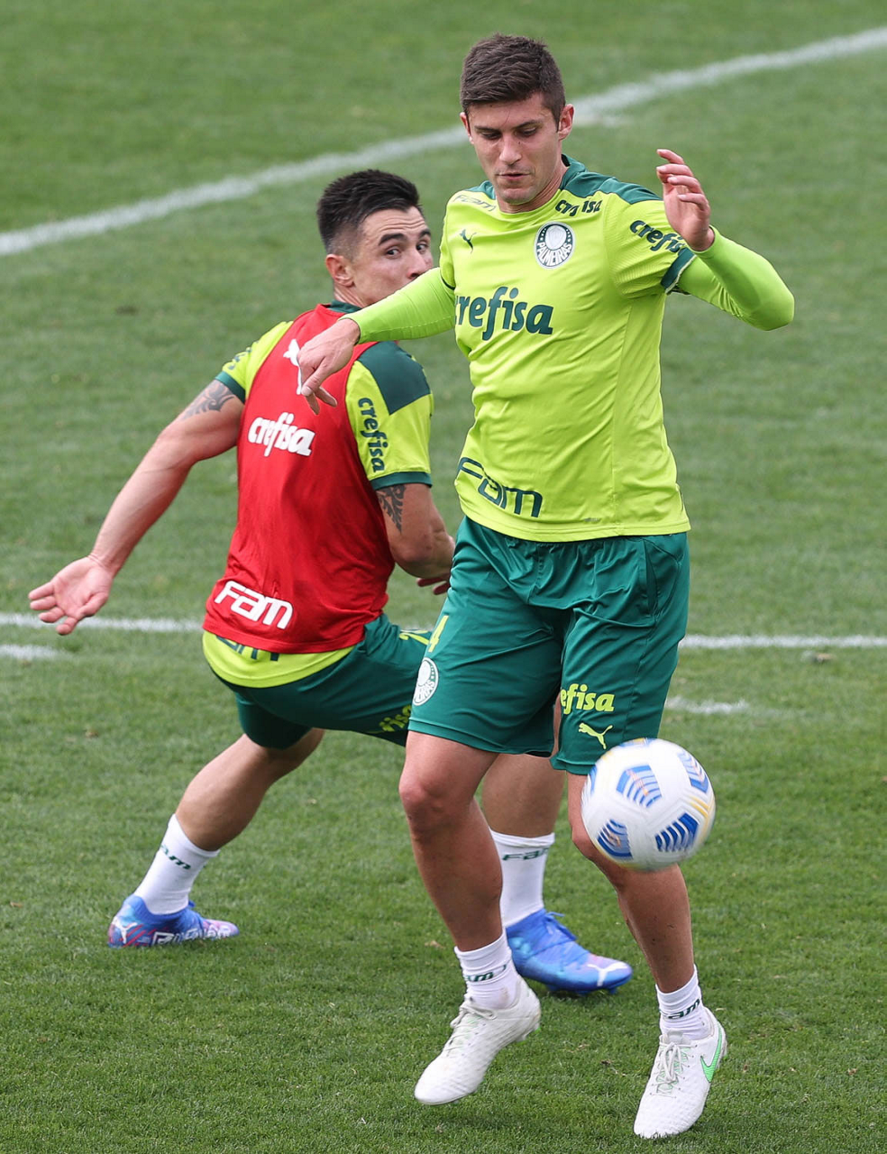 Os jogadores Benjamín Kuscevic e Willian (D), da SE Palmeiras, durante treinamento, na Academia de Futebol. (Foto: Cesar Greco)