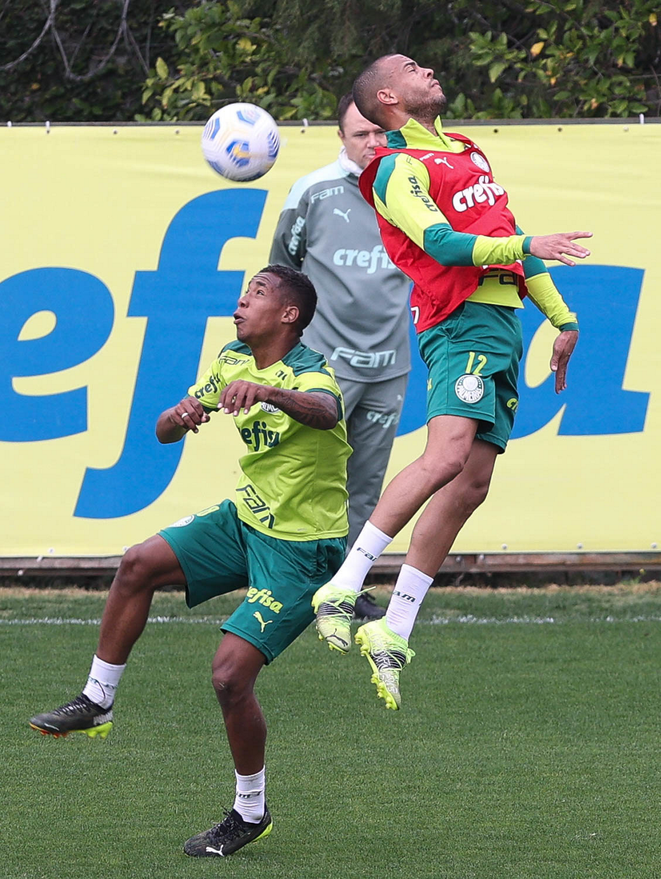 Os jogadores Michel e Deyverson (D), da SE Palmeiras, durante treinamento, na Academia de Futebol. (Foto: Cesar Greco)