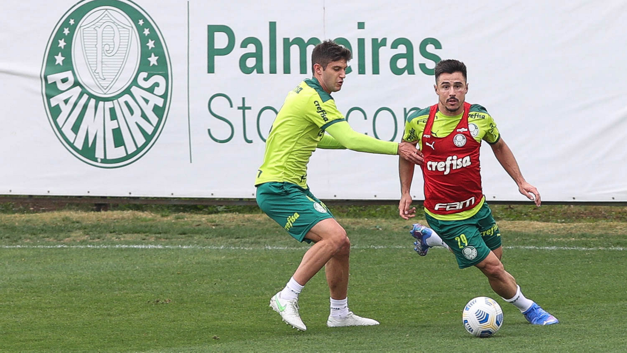 Os jogadores Matheus Fernandes e Danilo Barbosa (D), da SE Palmeiras, durante treinamento, na Academia de Futebol. (Foto: Cesar Greco)