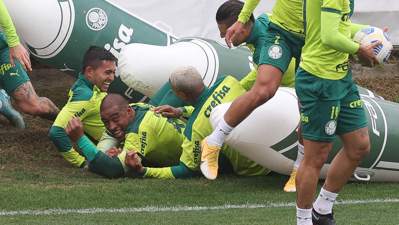 Os jogadores Raphael Veiga, Dudu, Danilo Barbosa, Jailson, Marcos Rocha, Zé Rafael, Victor Luis e Weverton (E/D em pé) e Deyverson, Breno Lopes, Mayke, Lucas Lima e Luan (E/D agachados), da SE Palmeiras, durante treinamento, na Academia de Futebol. (Foto: Cesar Greco)