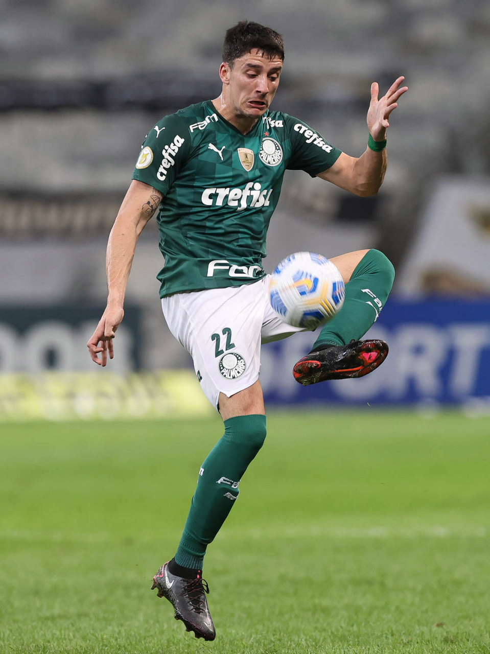 O jogador Joaquín Piquerez, da SE Palmeiras, em jogo contra a equipe do C Atlético Mineiro, durante partida válida pela décima sexta rodada, do Campeonato Brasileiro, Série A, no estádio Mineirão. (Foto: Cesar Greco)