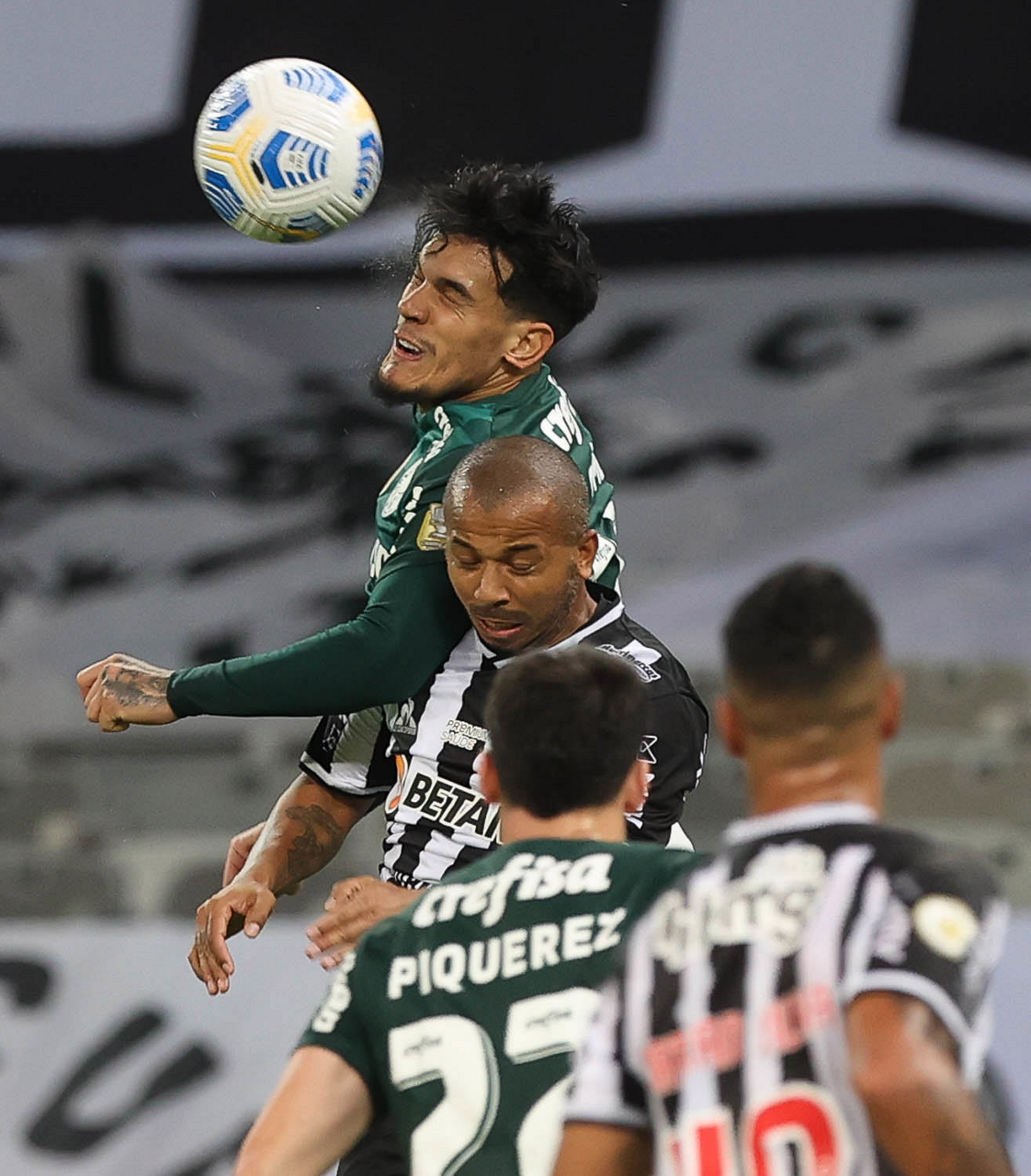 O jogador Gustavo Gómez, da SE Palmeiras, disputa bola com o jogador Jair, do C Atlético Mineiro, durante partida válida pela décima sexta rodada, do Campeonato Brasileiro, Série A, no estádio Mineirão. (Foto: Cesar Greco)