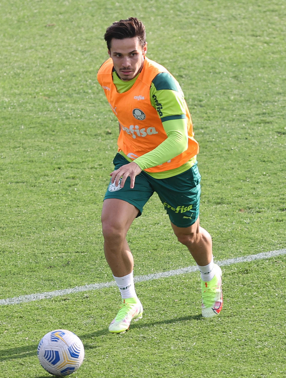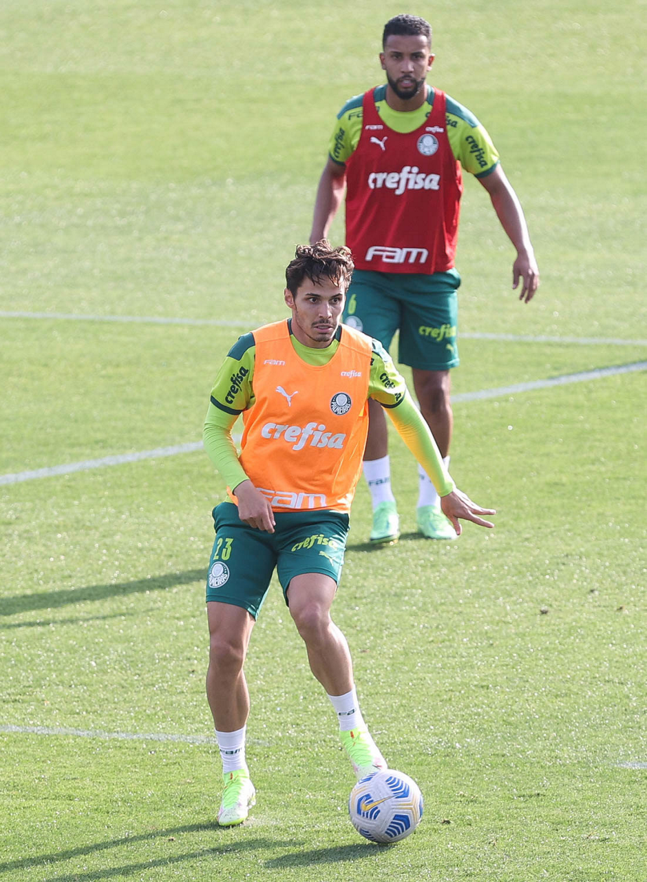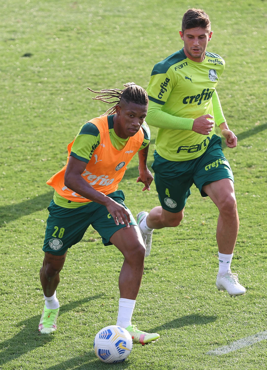 Os jogadores Gustavo Scarpa, Benjamín Kuscevic, Zé Rafael, Marcos Rocha, Breno Lopes, Renan e Felipe Melo (E/D em pé) e Patrick de Paula, Rony, Dudu e Matheus Fernandes (E/D agachados), da SE Palmeiras, durante treinamento, na Academia de Futebol. (Foto: Cesar Greco)