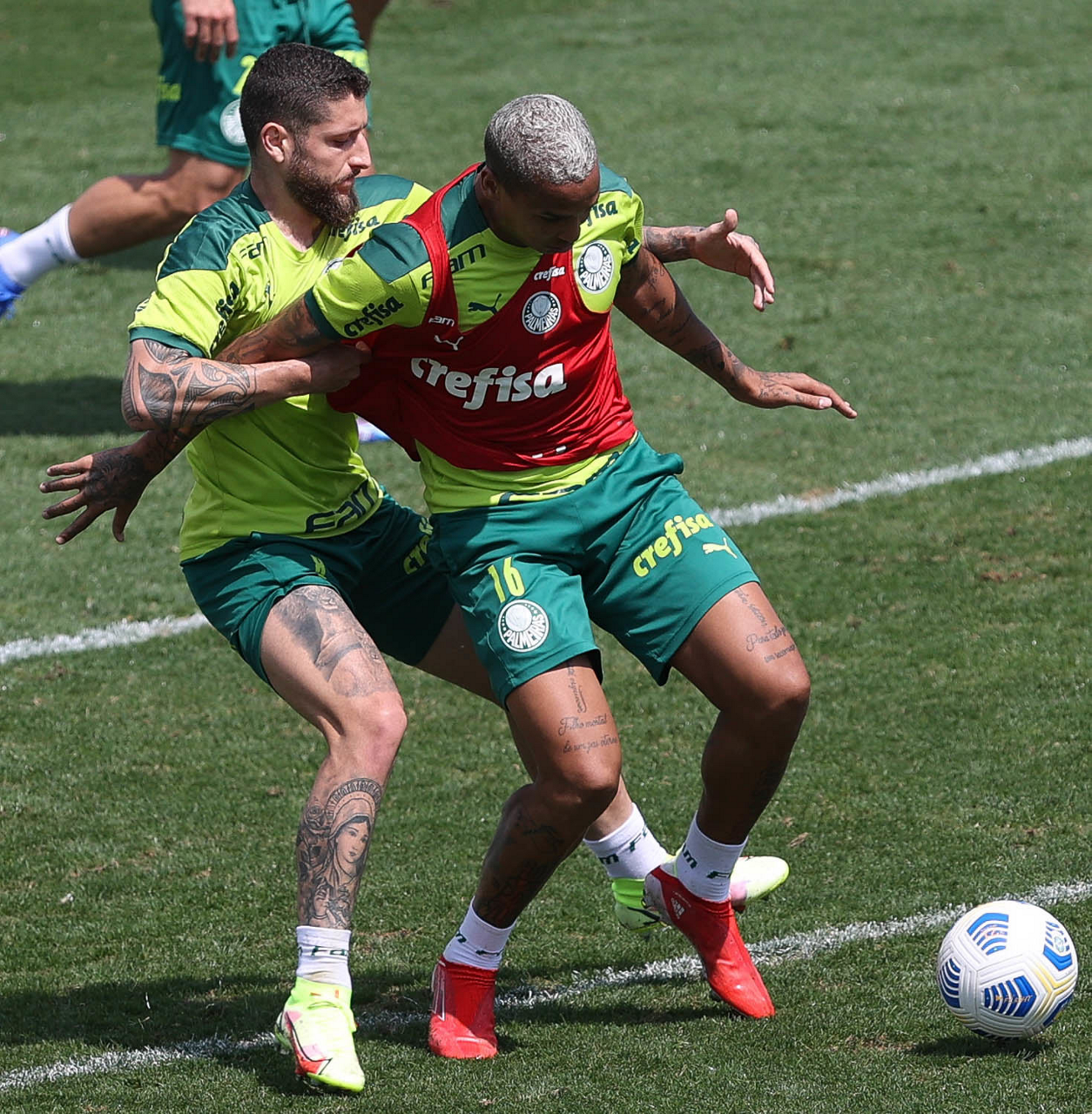 Os jogadores Danilo Barbosa e Deyverson (D), da SE Palmeiras, durante treinamento, na Academia de Futebol. (Foto: Cesar Greco)