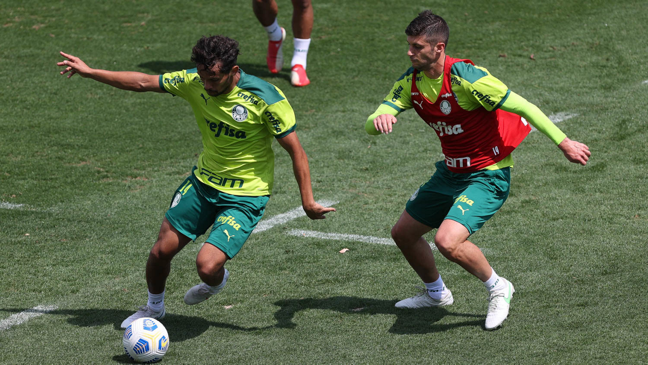 Os jogadores Gustavo Scarpa e Benjamín Kuscevic (D), da SE Palmeiras, durante treinamento, na Academia de Futebol. (Foto: Cesar Greco)