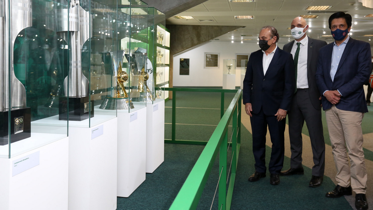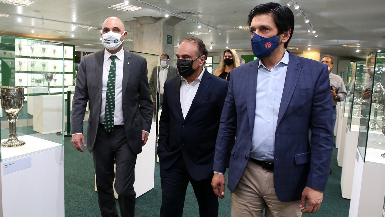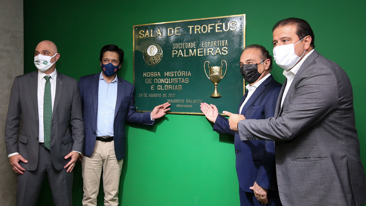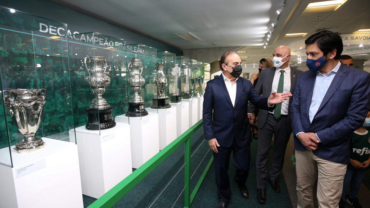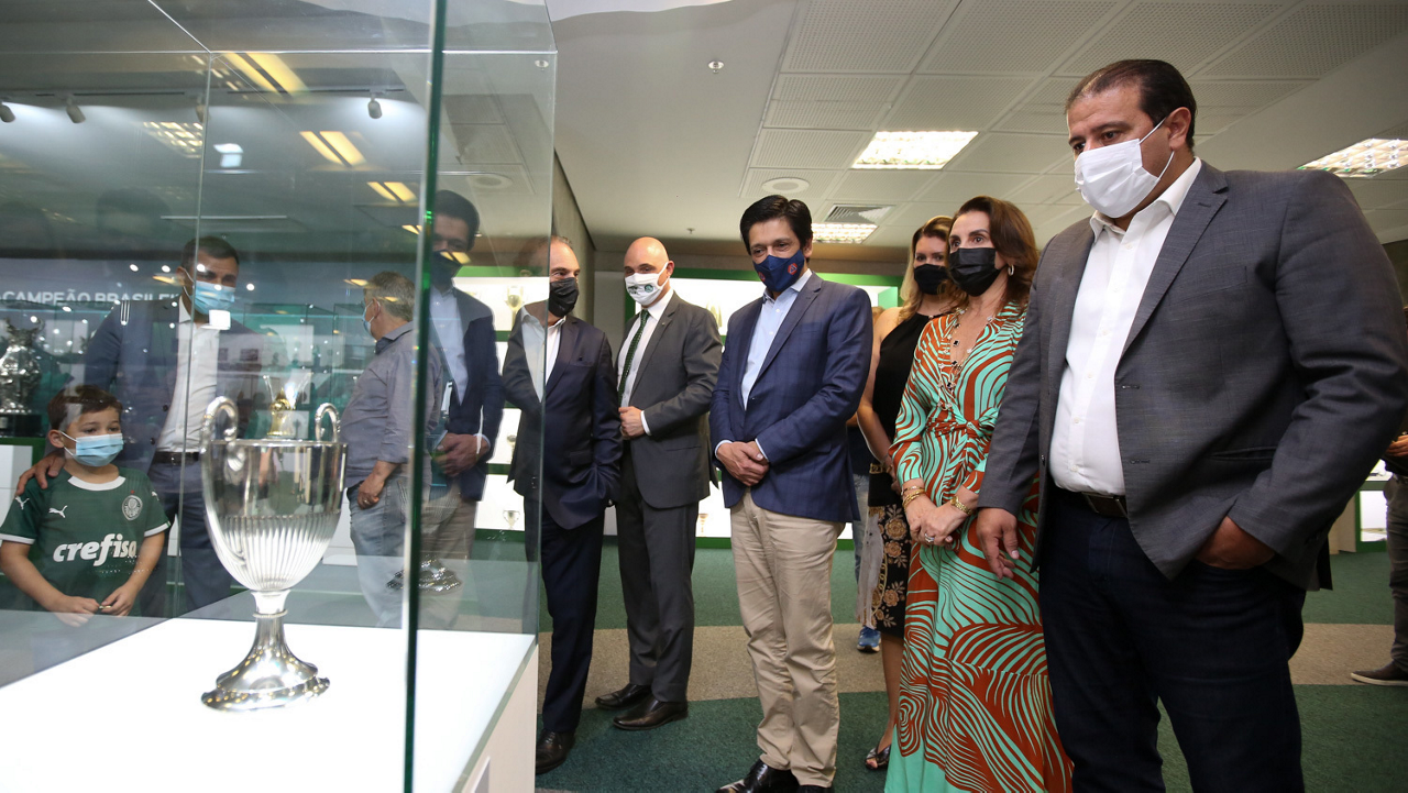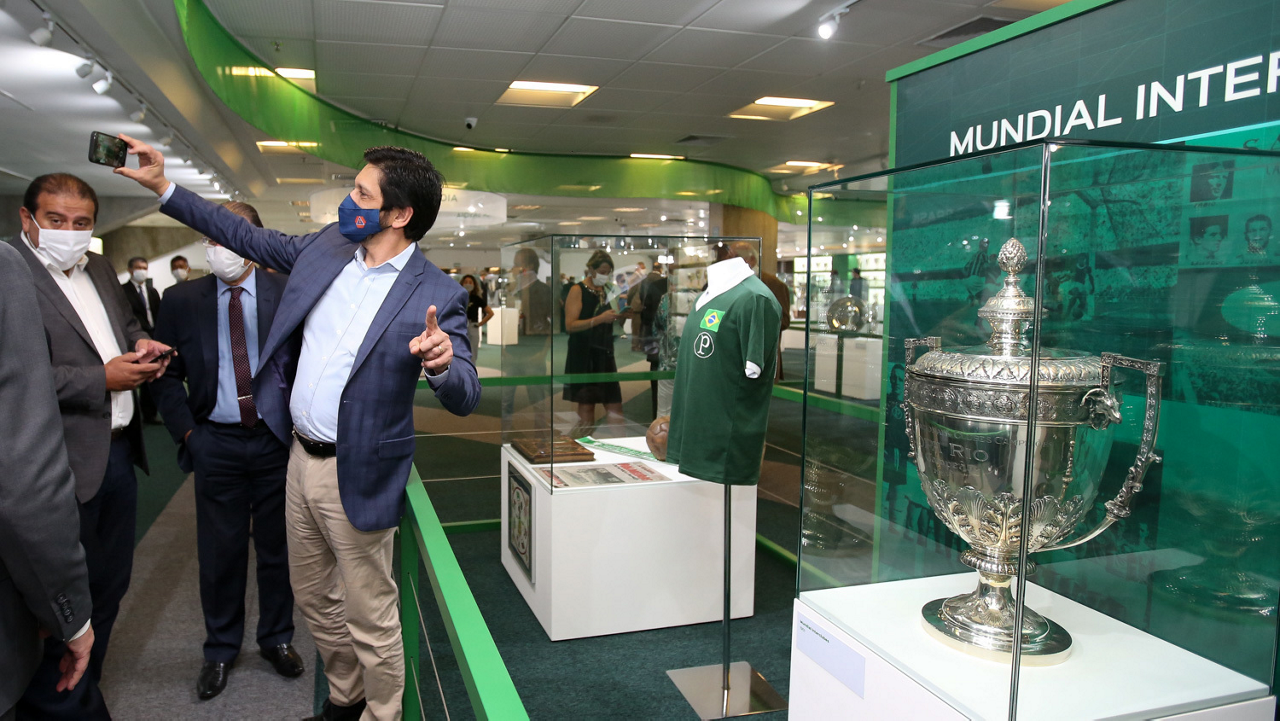 O prefeito Ricardo Nunes e outras autoridades da cidade de São Paulo visitam a Sala de Troféus do Palmeiras, no Allianz Parque. (Foto: Fabio Menotti/Palmeiras)