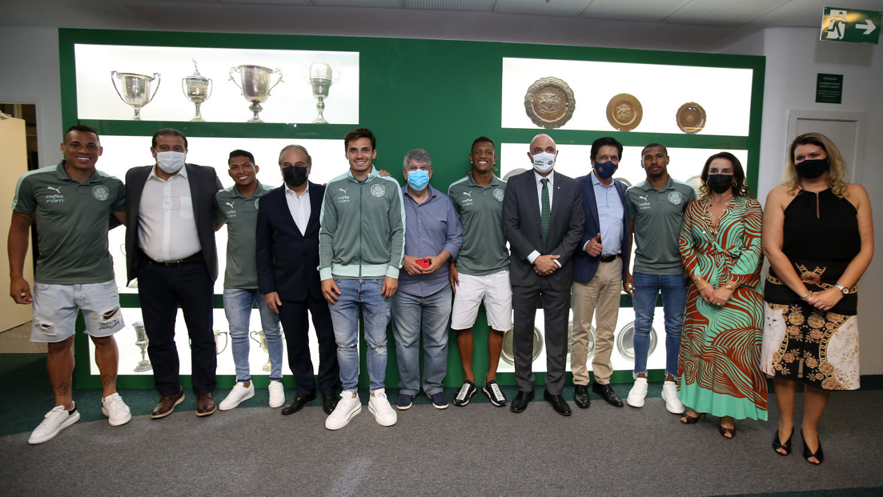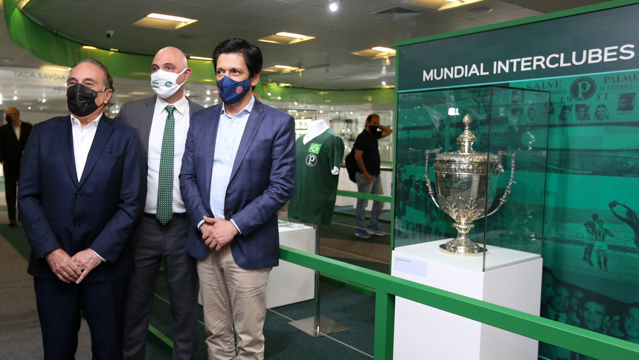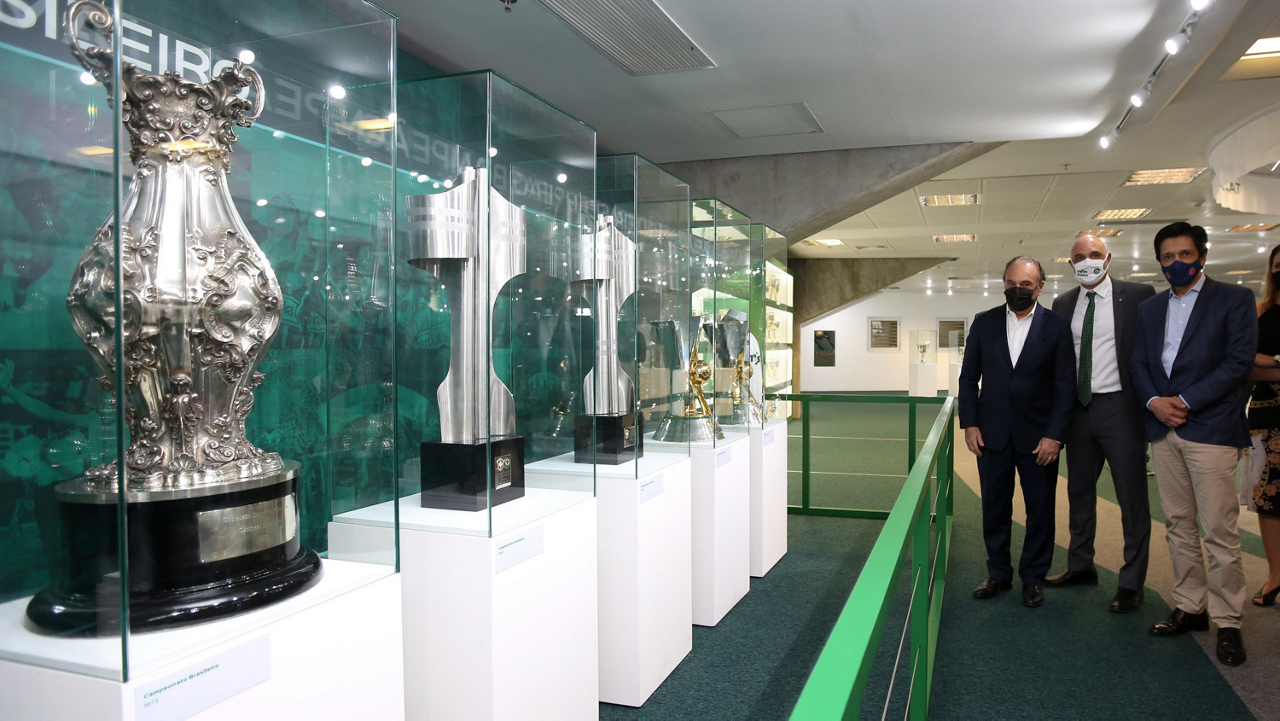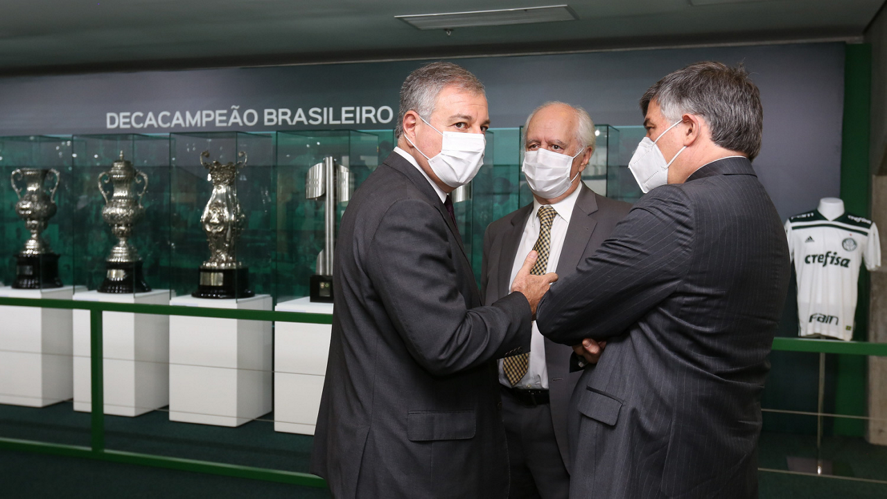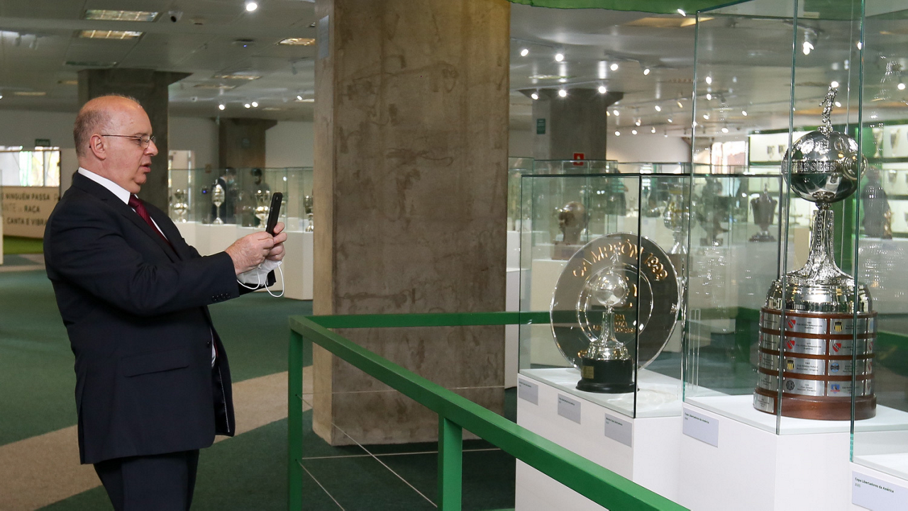 O prefeito Ricardo Nunes e outras autoridades da cidade de São Paulo visitam a Sala de Troféus do Palmeiras, no Allianz Parque. (Foto: Fabio Menotti/Palmeiras)