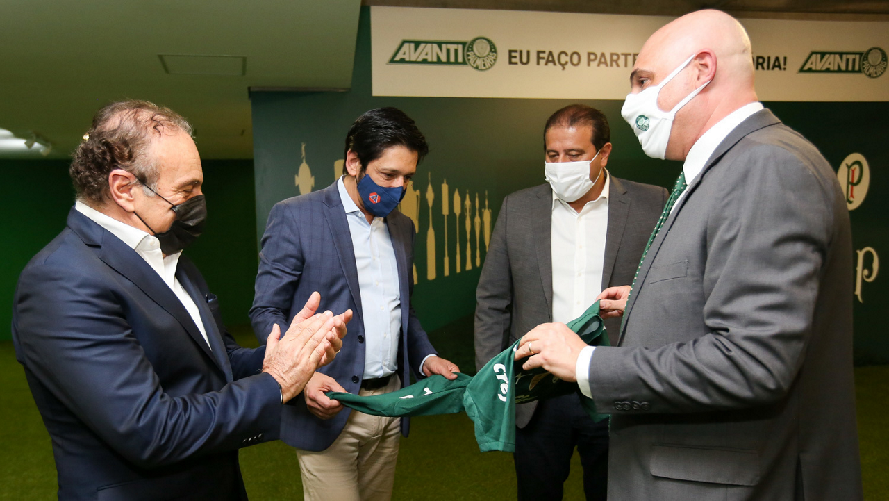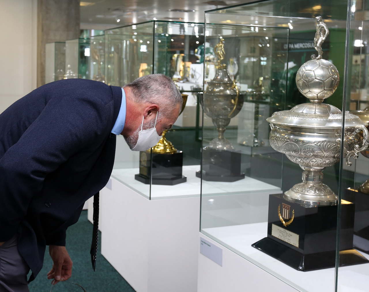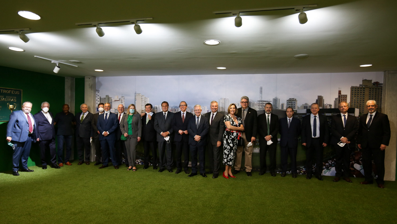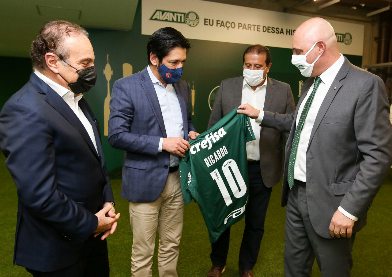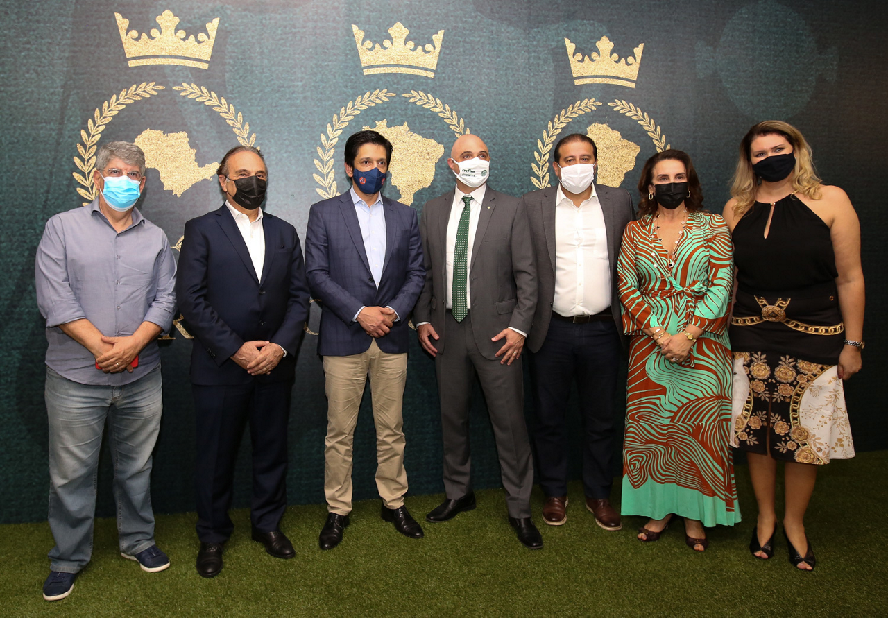 O prefeito Ricardo Nunes e outras autoridades da cidade de São Paulo visitam a Sala de Troféus do Palmeiras, no Allianz Parque. (Foto: Fabio Menotti/Palmeiras)