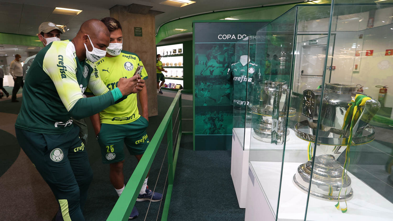 O auxiliar técnico Carlos Martinho, o auxiliar técnico Vitor Castanheira, o preparador físico João Martins, o técnico Abel Ferreira, o presidente Mauricio Galiotte, o analista de desempenho Tiago Costa (E/D), da SE Palmeiras, durante visita à Sala de Troféus, na arena Allianz Parque. (Foto: Cesar Greco)