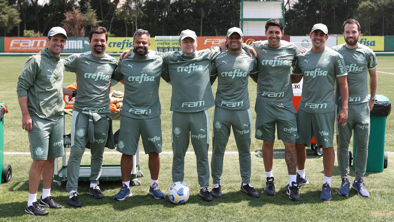 O preparador físico Marco Aurélio, o massagista Paulinho, o coordenador científico Daniel Gonçalves, o auxiliar técnico Andrey Lopes, o massagista Alan, o fisiologista Rudy Pracidelli, o preparador físico Thiago Maldonado, o médico Guilherme Dilda (E/D), da SE Palmeiras, durante treinamento, na Academia de Futebol. (Foto: Cesar Greco)