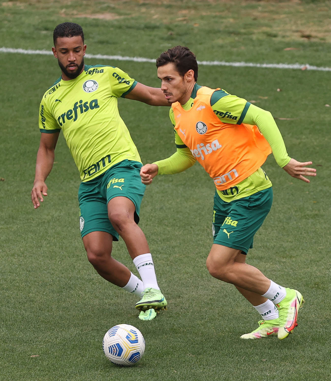 Os jogadores Jorge e Raphael Veiga (D), da SE Palmeiras, durante treinamento, na Academia de Futebol. (Foto: Cesar Greco)