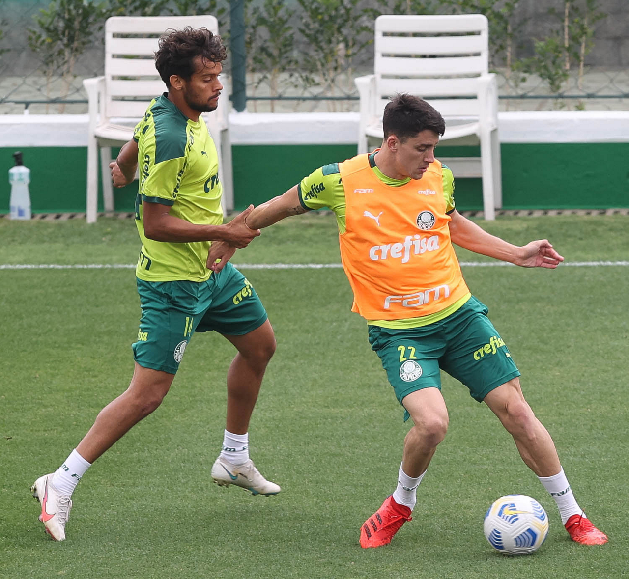 Os jogadores Gustavo Scarpa e Joaquín Piquerez (D), da SE Palmeiras, durante treinamento, na Academia de Futebol. (Foto: Cesar Greco)