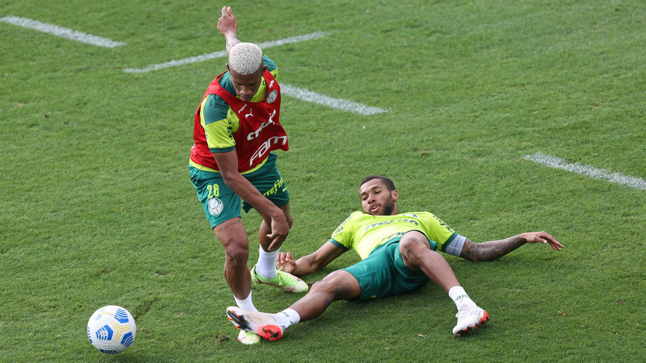 Os jogadores Deyverson e Danilo (D), da SE Palmeiras, durante treinamento, na Academia de Futebol. (Foto: Cesar Greco)