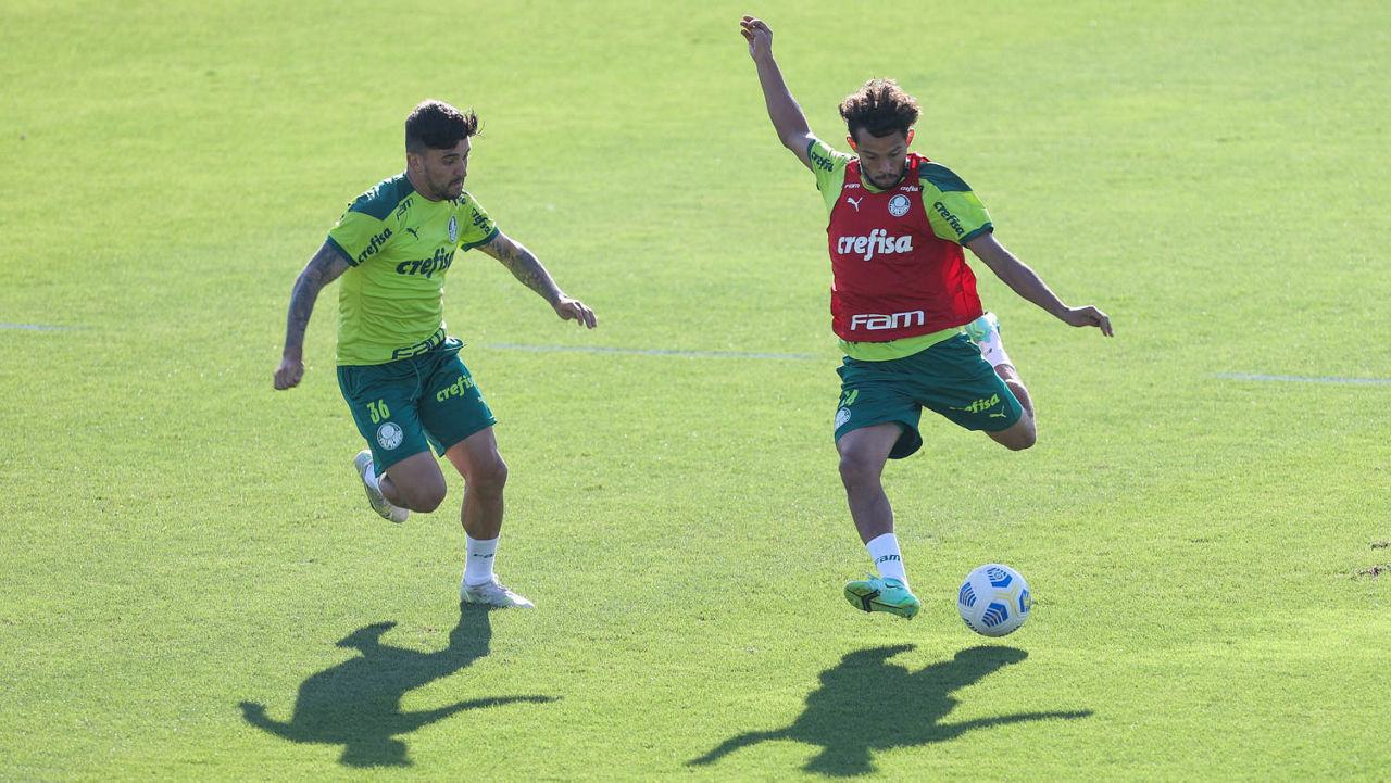 Os jogadores Gabriel Veron e Zé Rafael (D), da SE Palmeiras, durante treinamento, na Academia de Futebol. (Foto: Cesar Greco)