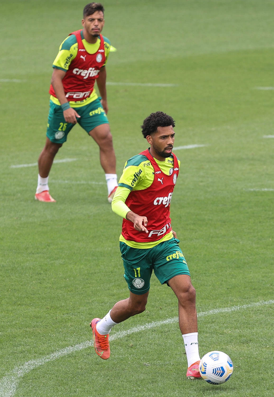 Os jogadores Gabriel Menino e Patrick de Paula (D), da SE Palmeiras, durante treinamento, na Academia de Futebol. (Foto: Cesar Greco)