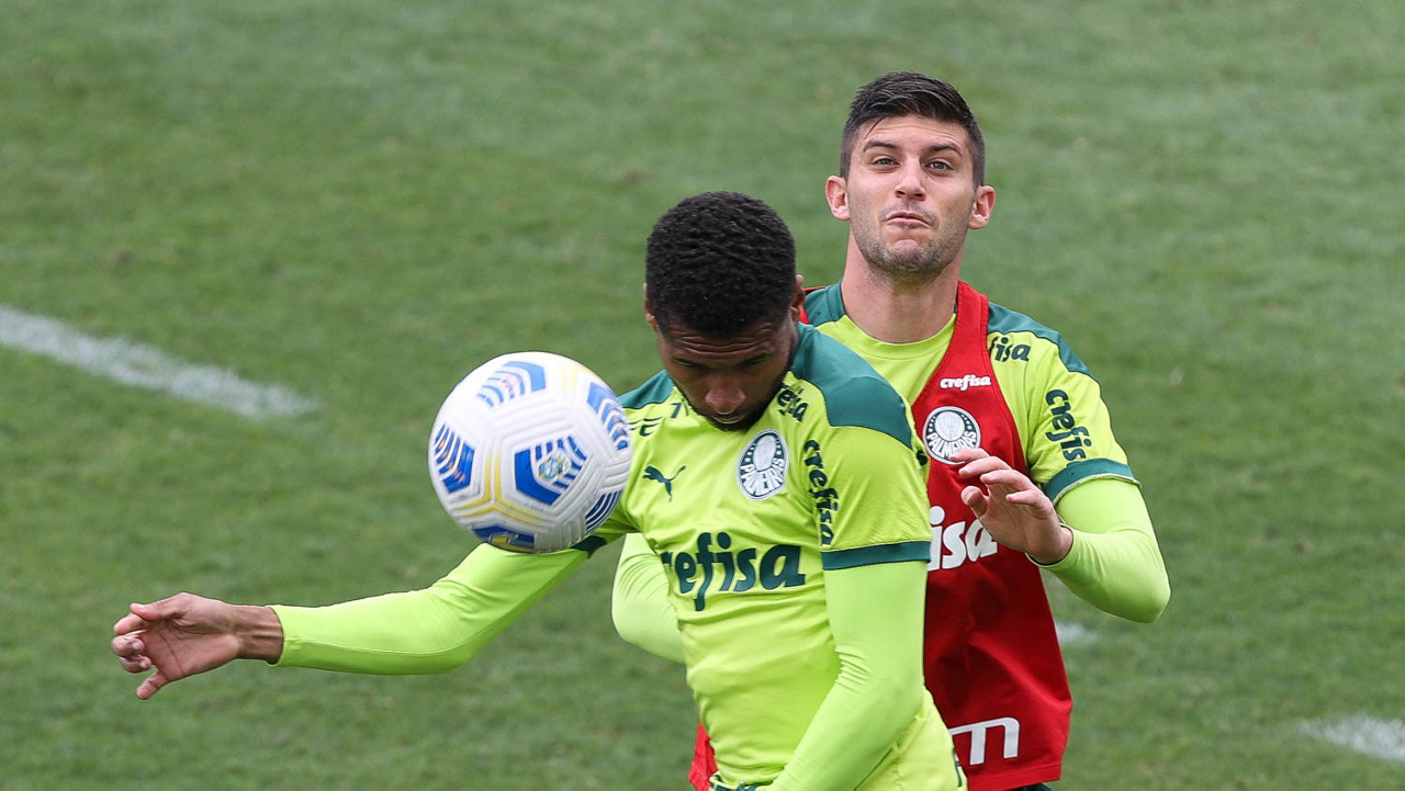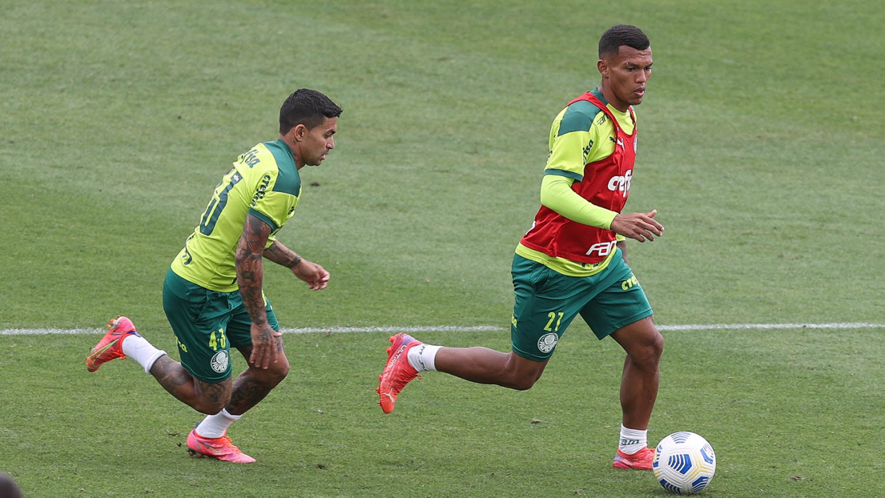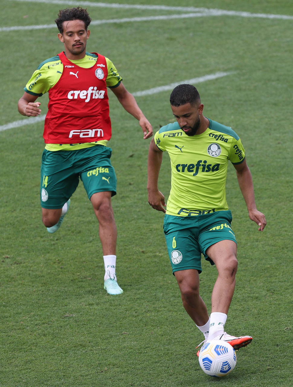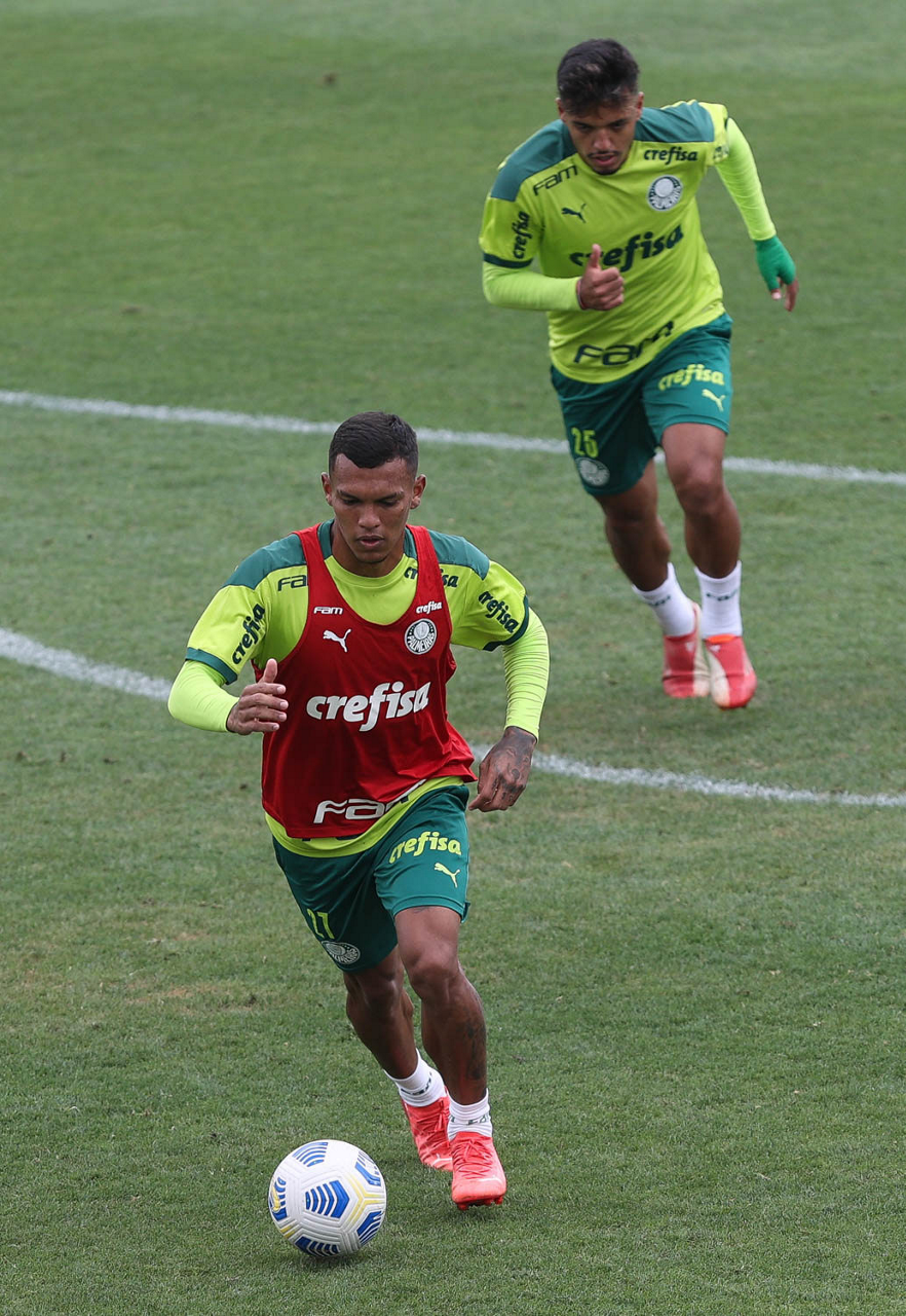 Os jogadores Raphael Veiga e Deyverson (D), da SE Palmeiras, durante treinamento, na Academia de Futebol. (Foto: Cesar Greco)