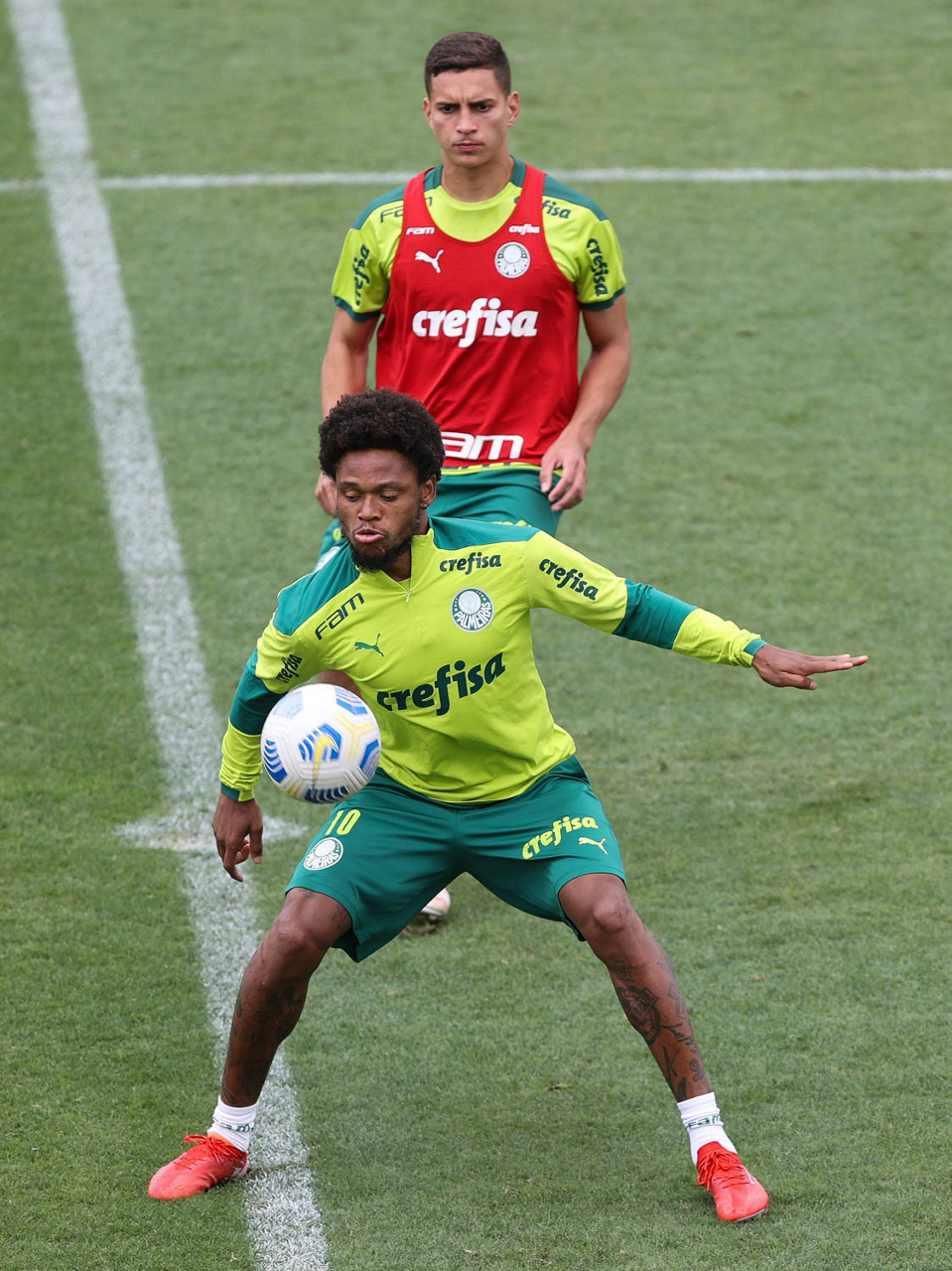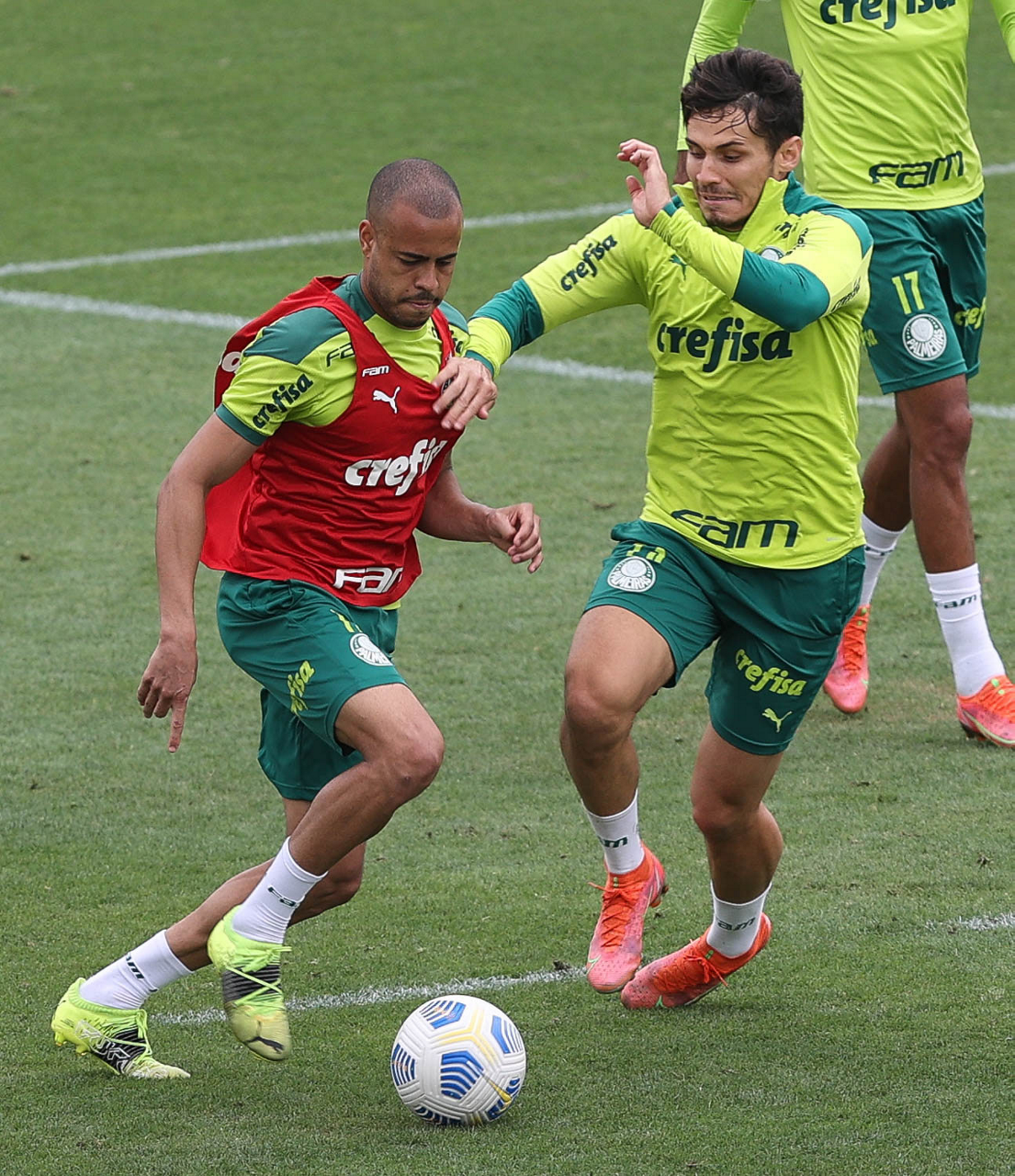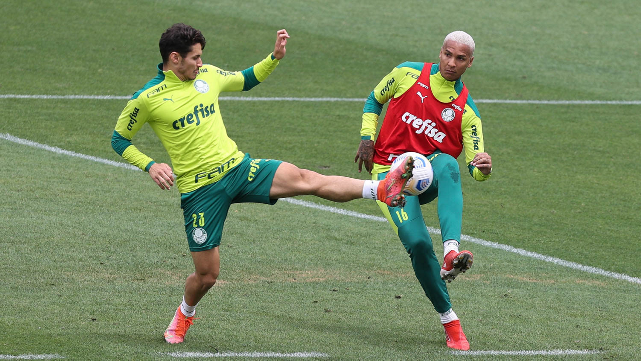 Os jogadores Raphael Veiga e Deyverson (D), da SE Palmeiras, durante treinamento, na Academia de Futebol. (Foto: Cesar Greco)