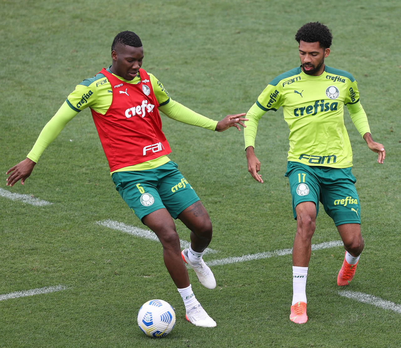 Os jogadores Patrick de Paula e Matheus Fernandes (D), da SE Palmeiras, durante treinamento, na Academia de Futebol. (Foto: Cesar Greco)