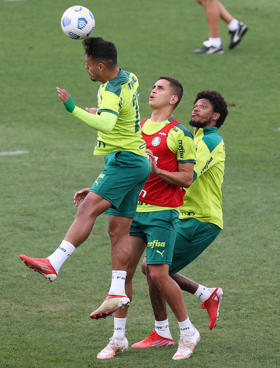 Os jogadores Gabriel Menino, Renan e Luiz Adriano (E/D), da SE Palmeiras, durante treinamento, na Academia de Futebol. (Foto: Cesar Greco)