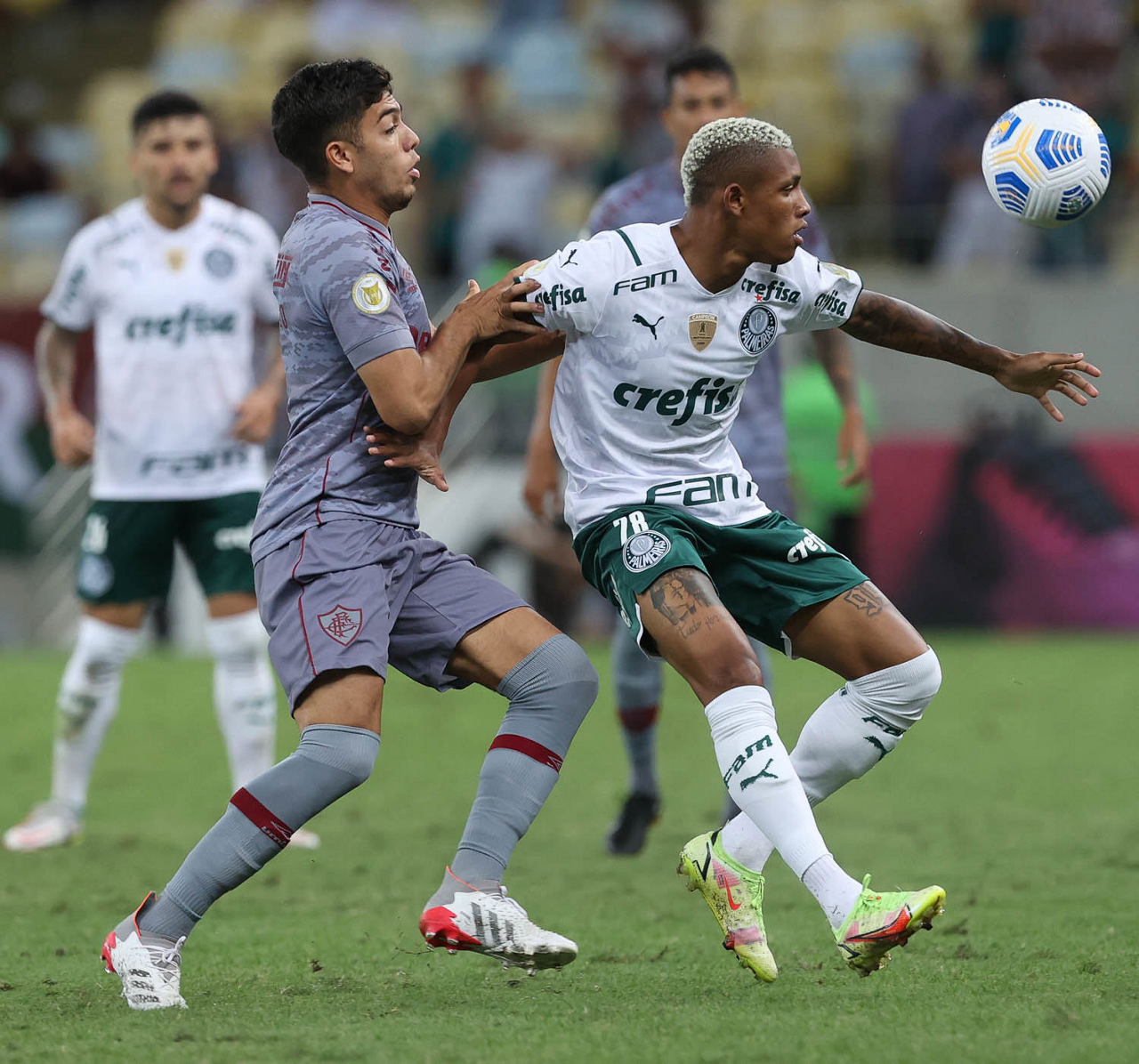 O jogador Gabriel Menino, da SE Palmeiras, disputa bola com o jogador, do Fluminense FC, durante partida válida pela trigésima segunda rodada, do Campeonato Brasileiro, Série A, no estádio do Maracanã. (Foto: Cesar Greco)