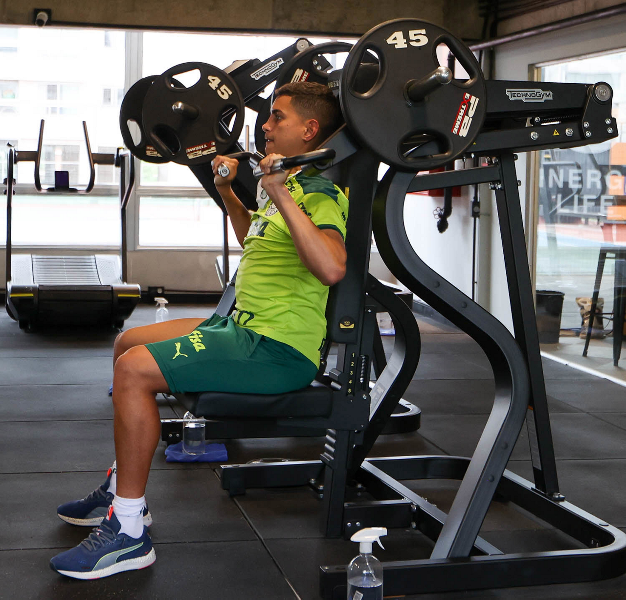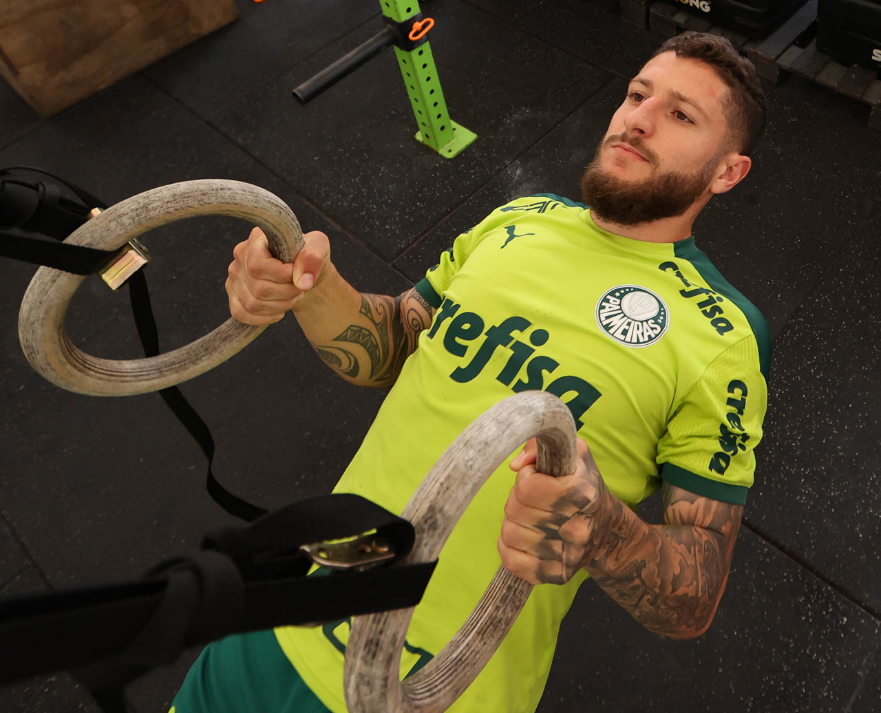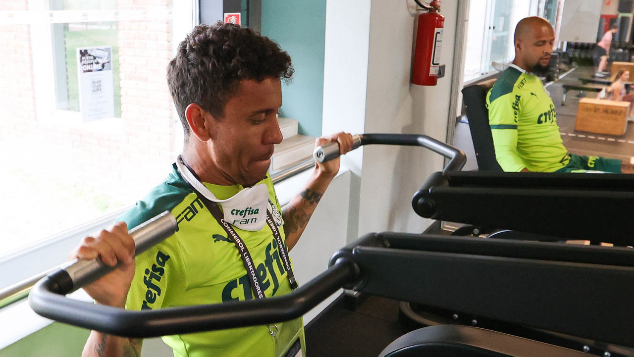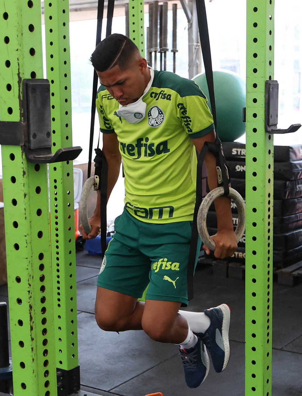 O jogador Raphael Veiga, da SE Palmeiras, durante treinamento, em academia próximo ao hotel de concentração da equipe, em Montevidéu. (Foto: Cesar Greco)