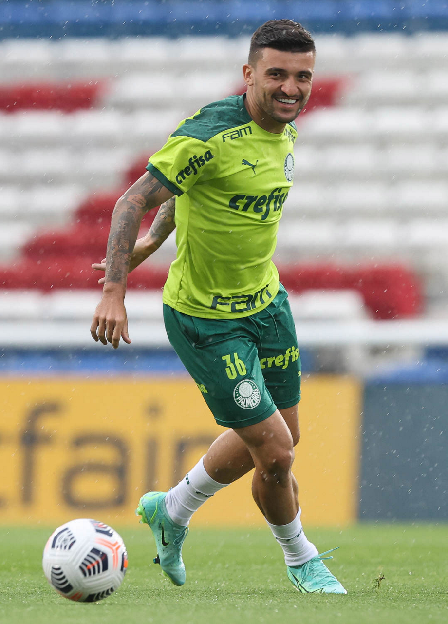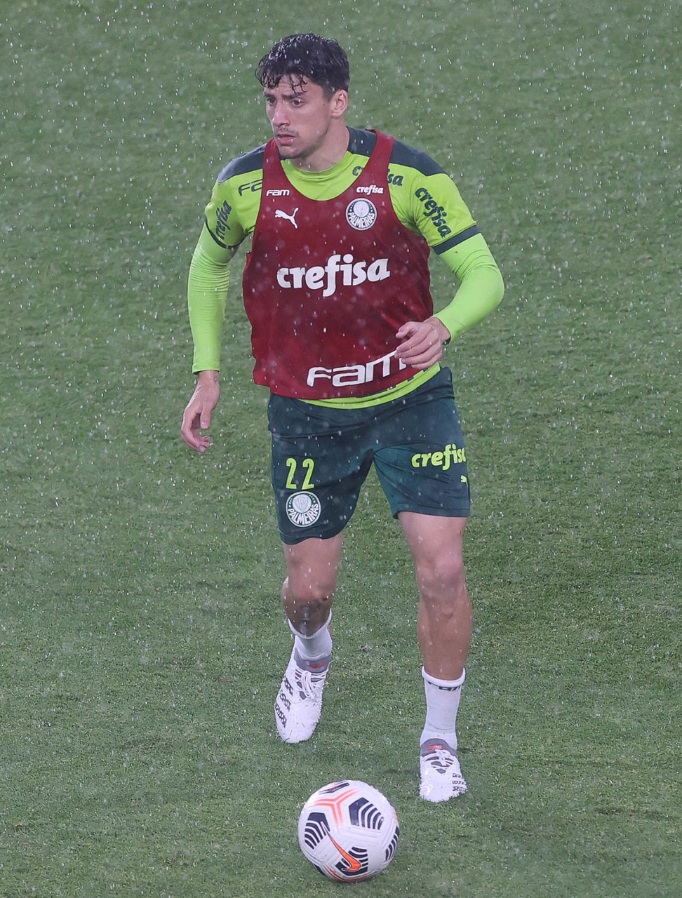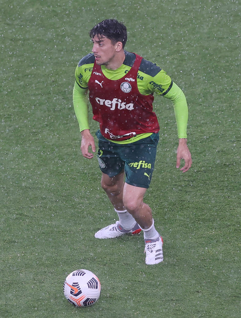 O jogador Raphael Veiga, da SE Palmeiras, durante treinamento, no Estádio Gran Parque Central, em Montevidéu. (Foto: Cesar Greco)