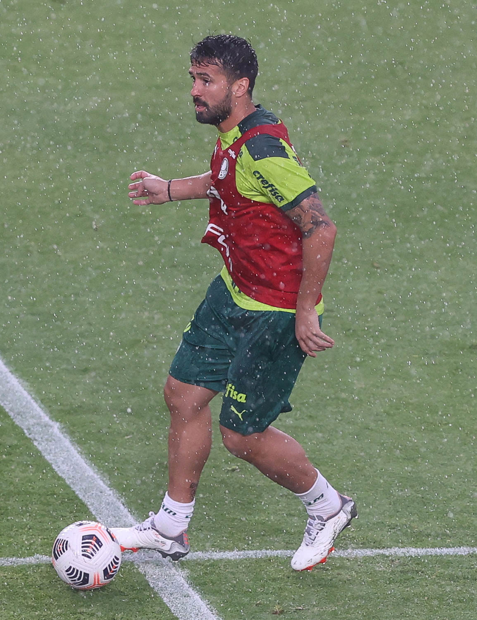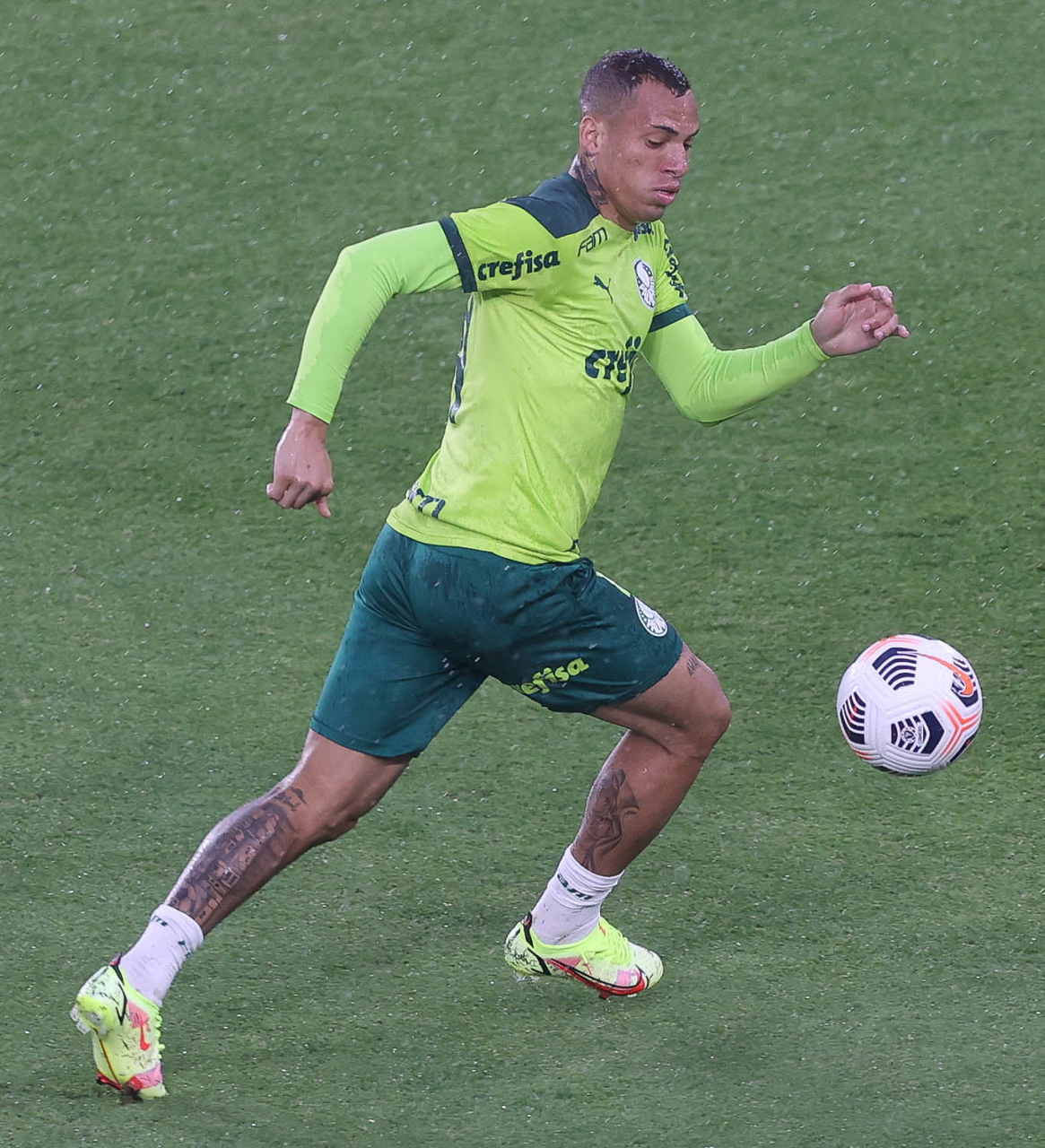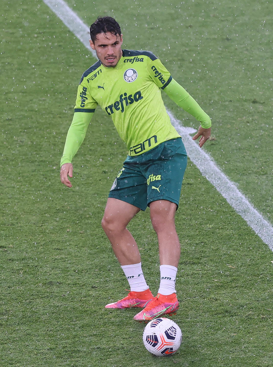 O jogador Raphael Veiga, da SE Palmeiras, durante treinamento, no Estádio Gran Parque Central, em Montevidéu. (Foto: Cesar Greco)