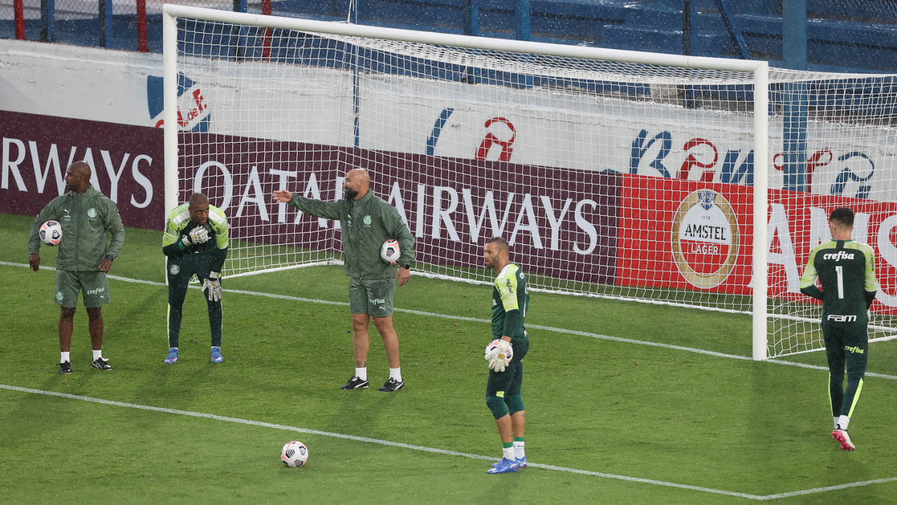 Os preparadores de goleiro Thales Damasceno e Rogerio Godoy (E e C) e os goleiros Jailson, Weverton e Vinicius (E/D), da SE Palmeiras, durante treinamento, no Estádio Gran Parque Central, em Montevidéu. (Foto: Cesar Greco)