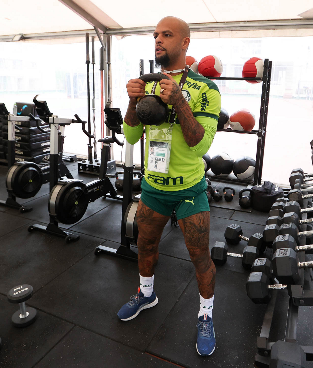 O jogador Felipe Melo, da SE Palmeiras, durante treinamento, em academia próximo ao hotel de concentração da equipe, em Montevidéu. (Foto: Cesar Greco)