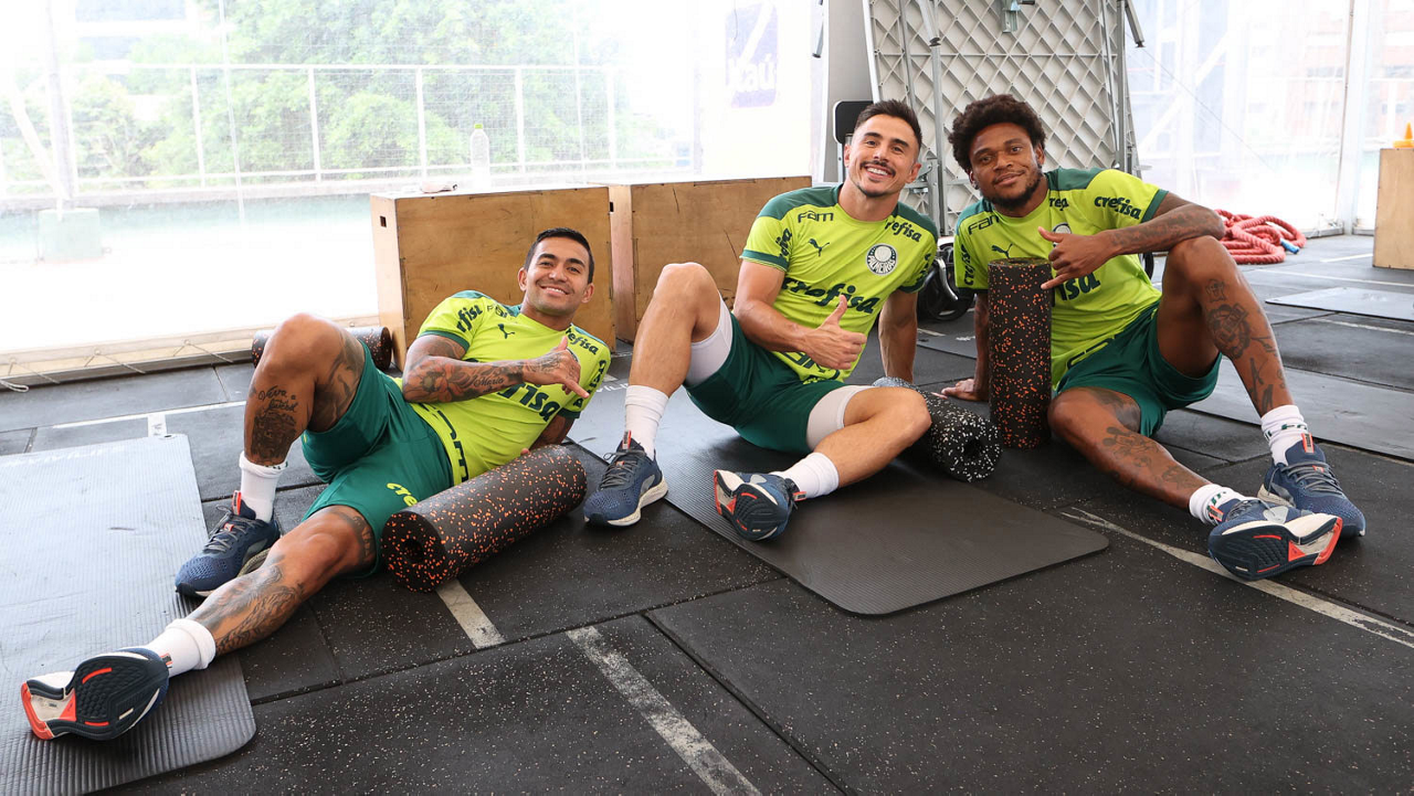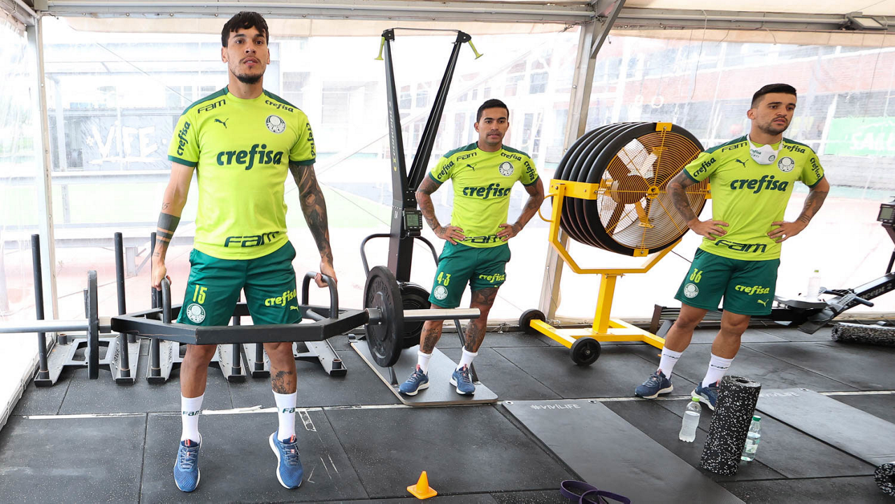 Os jogadores Gustavo Gómez, Dudu e Victor Luis (E/D), da SE Palmeiras, durante treinamento, em academia próximo ao hotel de concentração da equipe, em Montevidéu. (Foto: Cesar Greco)