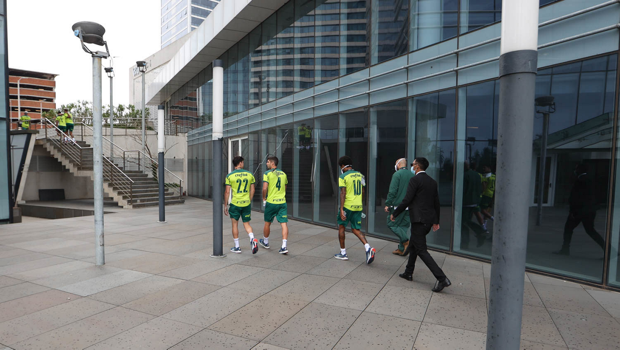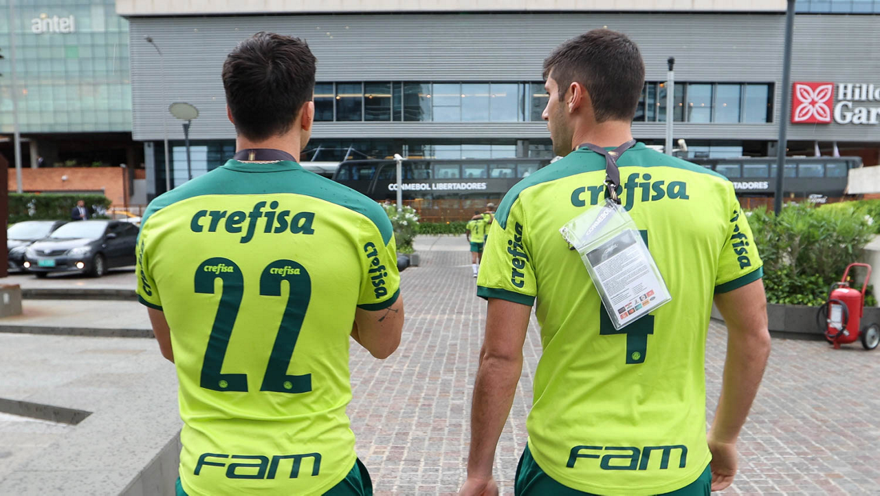 Os jogadores Joaquín Piquerez, Benjamín Kuscevic e Luiz Adriano (E/D), da SE Palmeiras, embarcam para o treinamento, no Estádio Gran Parque Central, em Montevidéu. (Foto: Cesar Greco)
