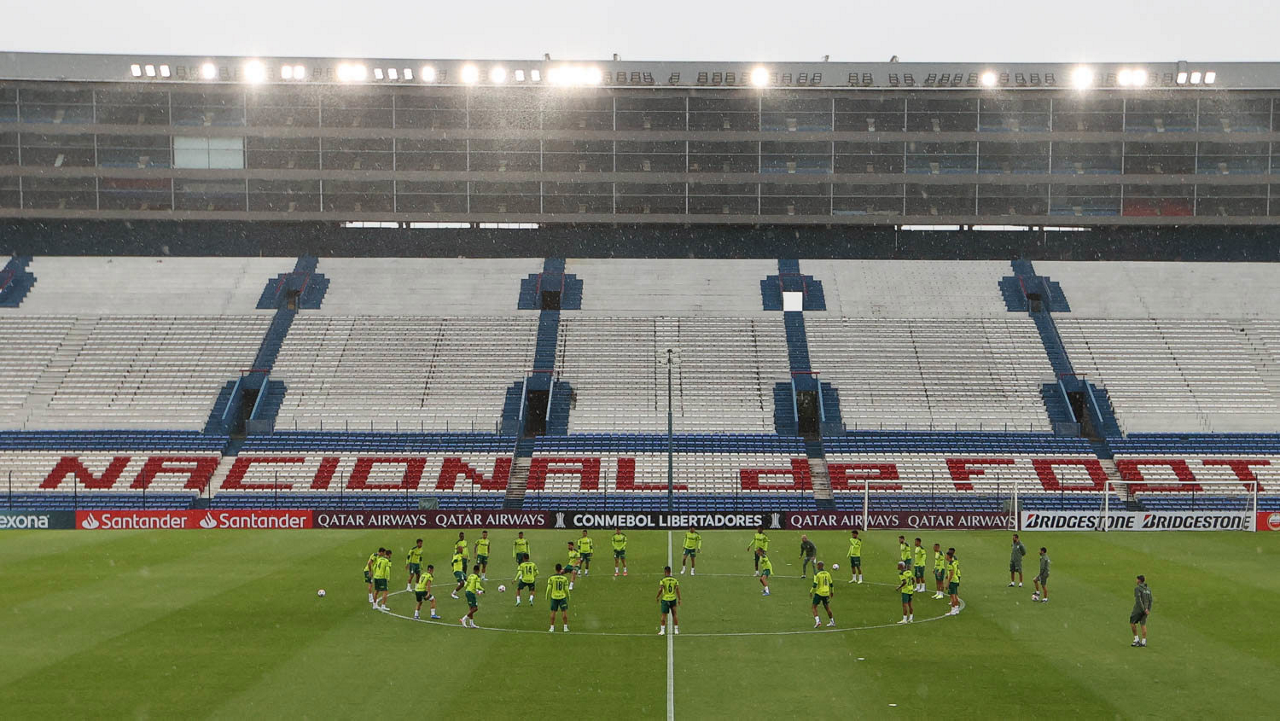 Os jogadores da SE Palmeiras, durante treinamento, no Estádio Gran Parque Central, em Montevidéu. (Foto: Cesar Greco)