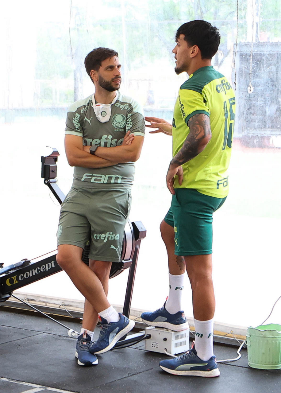 O auxiliar técnico Carlos Martinho e o jogador Gustavo Gómez (D), da SE Palmeiras, durante treinamento, em academia próximo ao hotel de concentração da equipe, em Montevidéu. (Foto: Cesar Greco)
