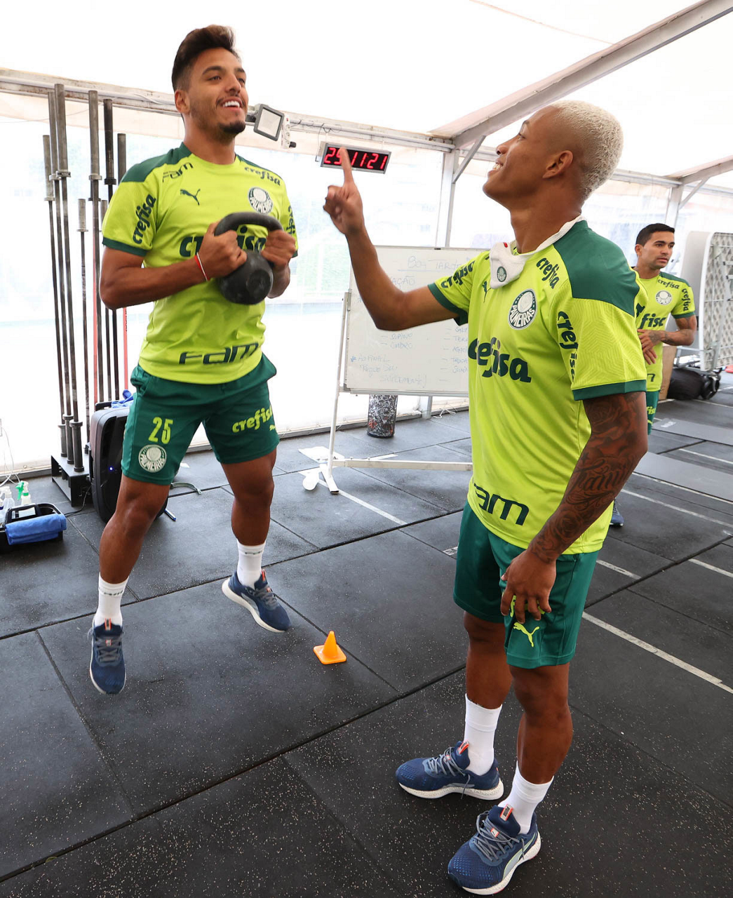 Os jogadores Gabriel Menino e Danilo (D), da SE Palmeiras, durante treinamento, em academia próximo ao hotel de concentração da equipe, em Montevidéu. (Foto: Cesar Greco)