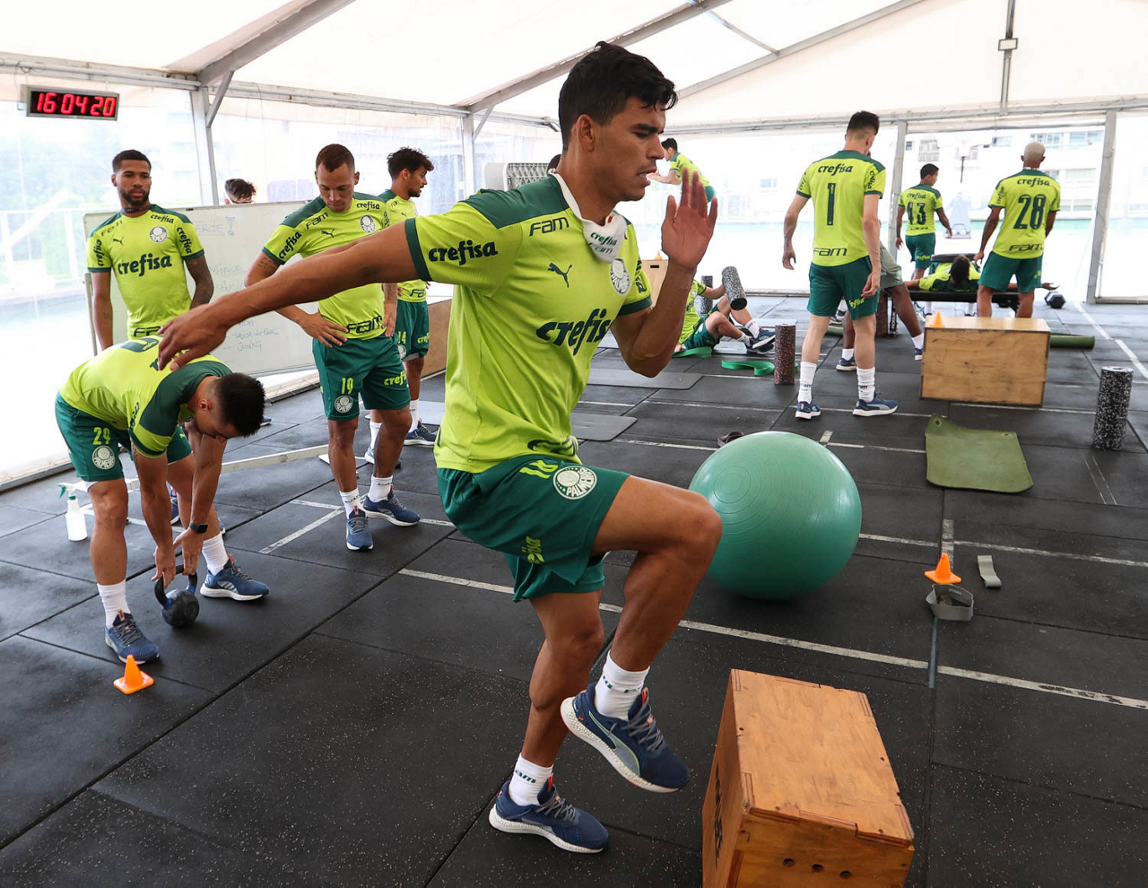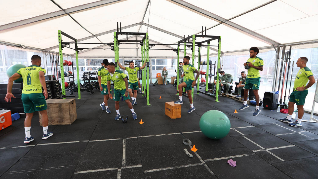 Os jogadores da SE Palmeiras, durante treinamento, em academia próximo ao hotel de concentração da equipe, em Montevidéu. (Foto: Cesar Greco)