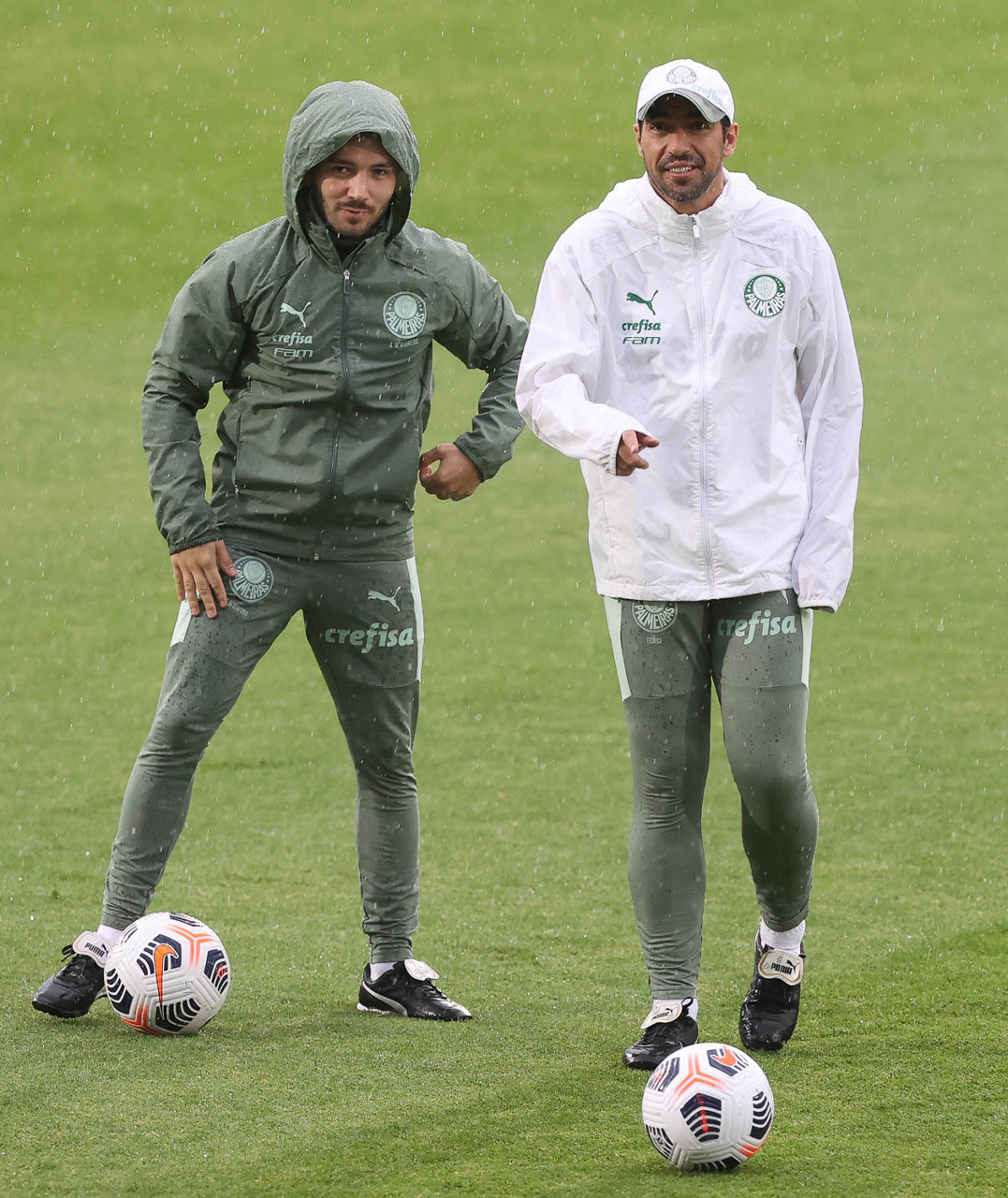 O técnico Abel Ferreira e o analista de desempenho Tiago Costa (E), da SE Palmeiras, durante treinamento, no Estádio Gran Parque Central, em Montevidéu. (Foto: Cesar Greco)