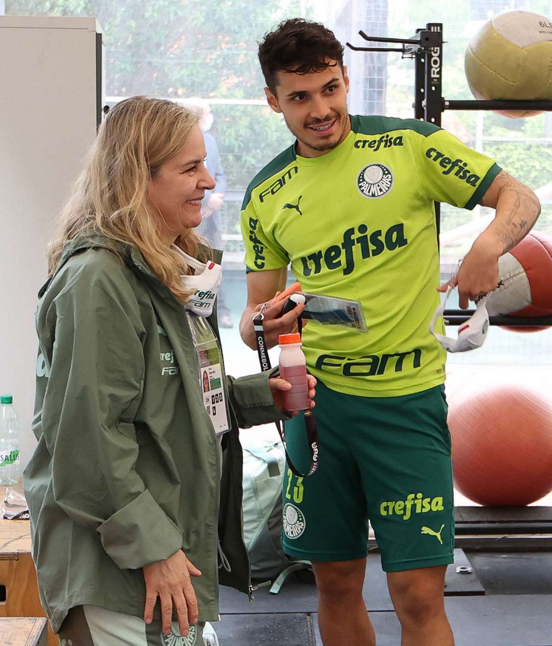 A nutricionista Mirtes Stancanelli e o jogador Raphael Veiga (D), da SE Palmeiras, durante treinamento, em academia próximo ao hotel de concentração da equipe, em Montevidéu. (Foto: Cesar Greco)