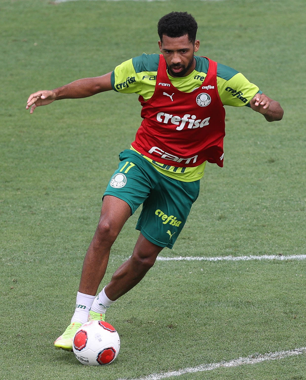 O jogador Raphael Veiga, da SE Palmeiras, durante treinamento, na Academia de Futebol. (Foto: Cesar Greco)