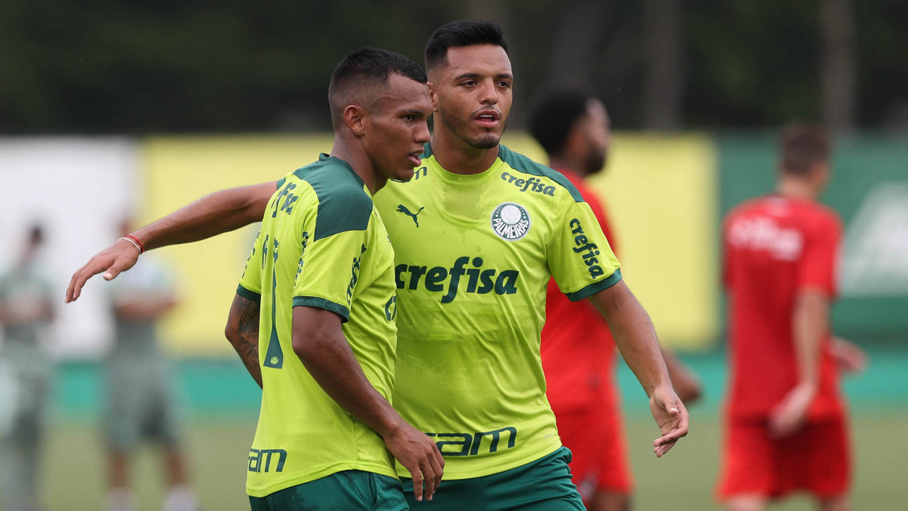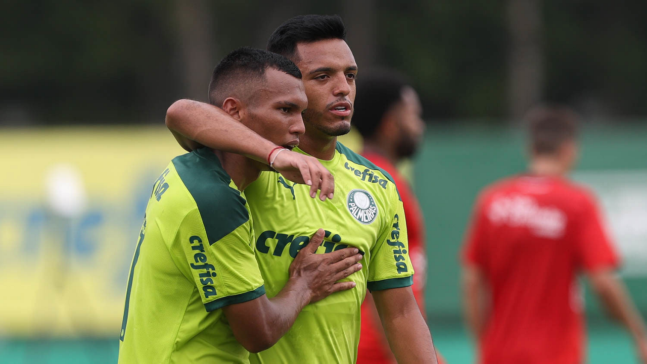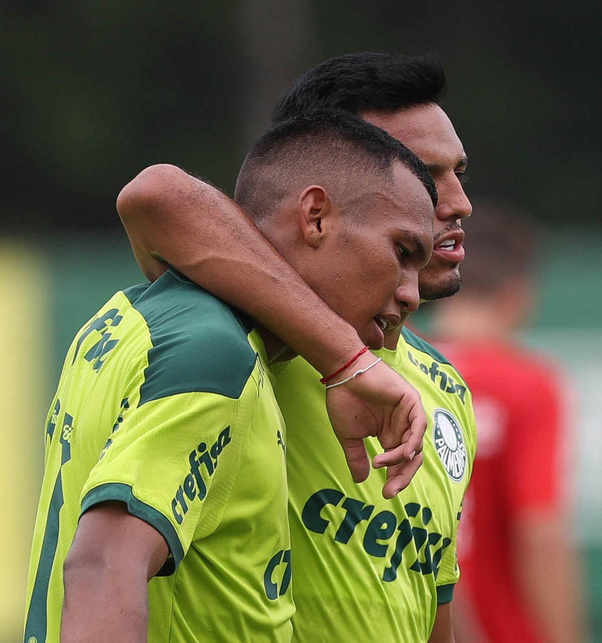 Os jogadores Gabriel Veron e Gabriel Menino (D), da SE Palmeiras, durante jogo-treino contra a equipe do Juventus, na Academia de Futebol. (Foto: Cesar Greco)