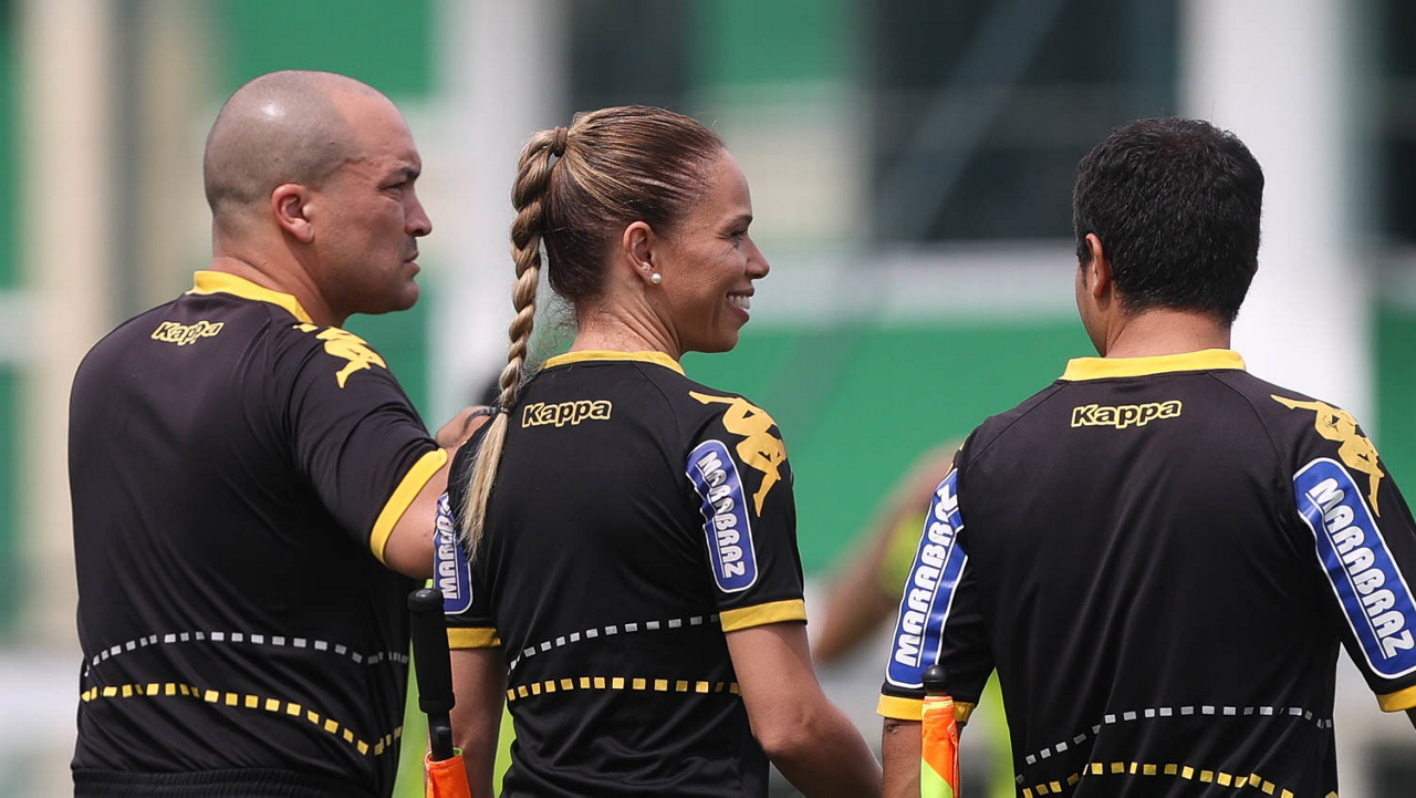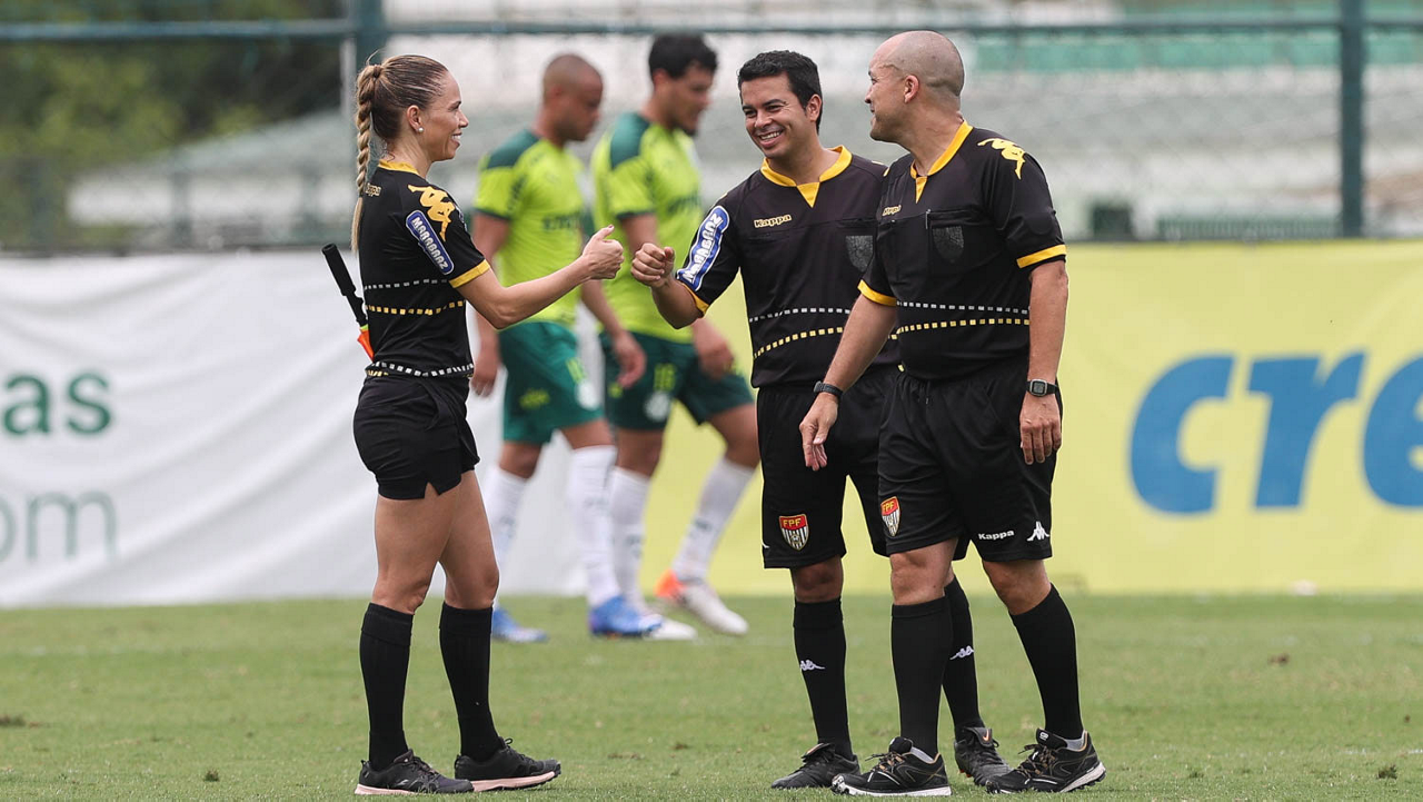 O trio de arbitragem do jogo-treino entre as equipes da SE Palmeiras e Juventus, na Academia de Futebol. (Foto: Cesar Greco)