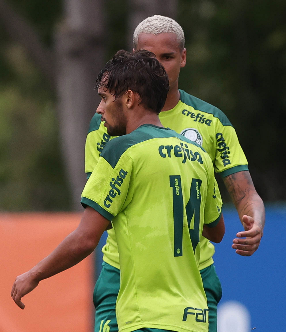 Os jogadores Gustavo Scarpa e Deyverson (D), da SE Palmeiras, durante jogo-treino contra a equipe do Primavera, na Academia de Futebol. (Foto: Cesar Greco)