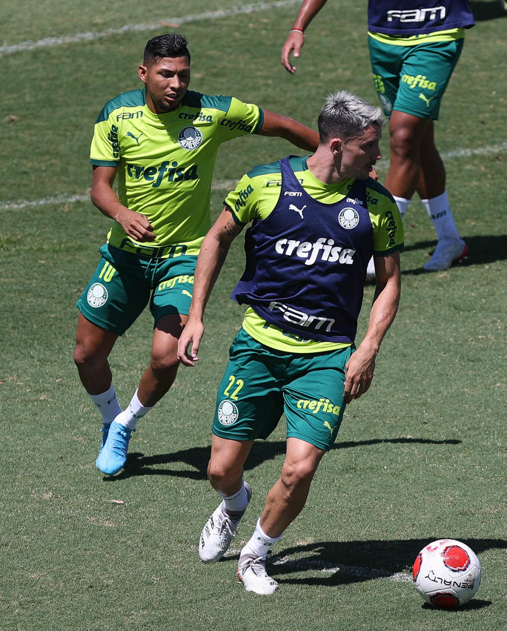 Os jogadores Rony e Joaquín Piquerez (D), da SE Palmeiras, durante treinamento, na Academia de Futebol. (Foto: Cesar Greco)