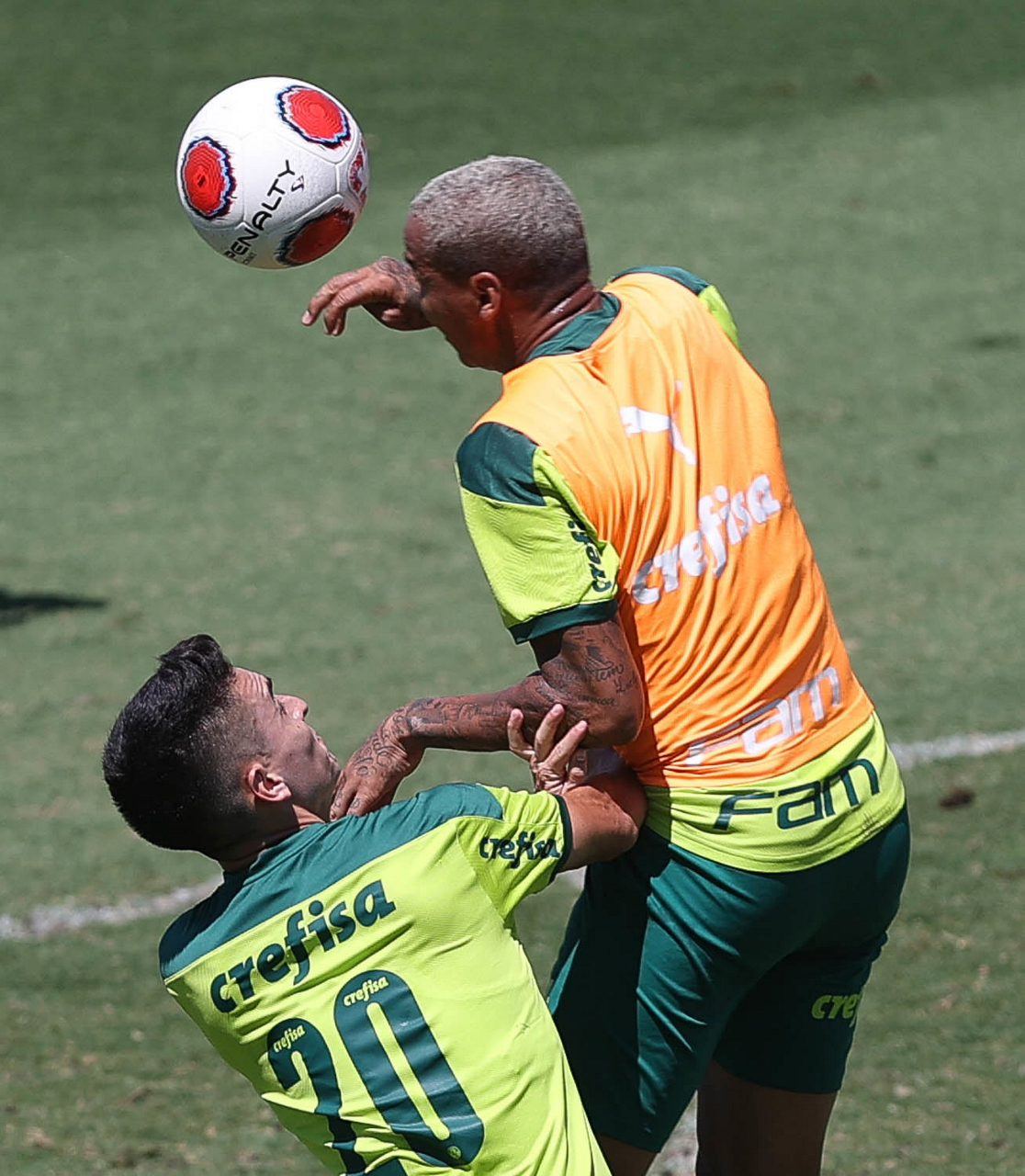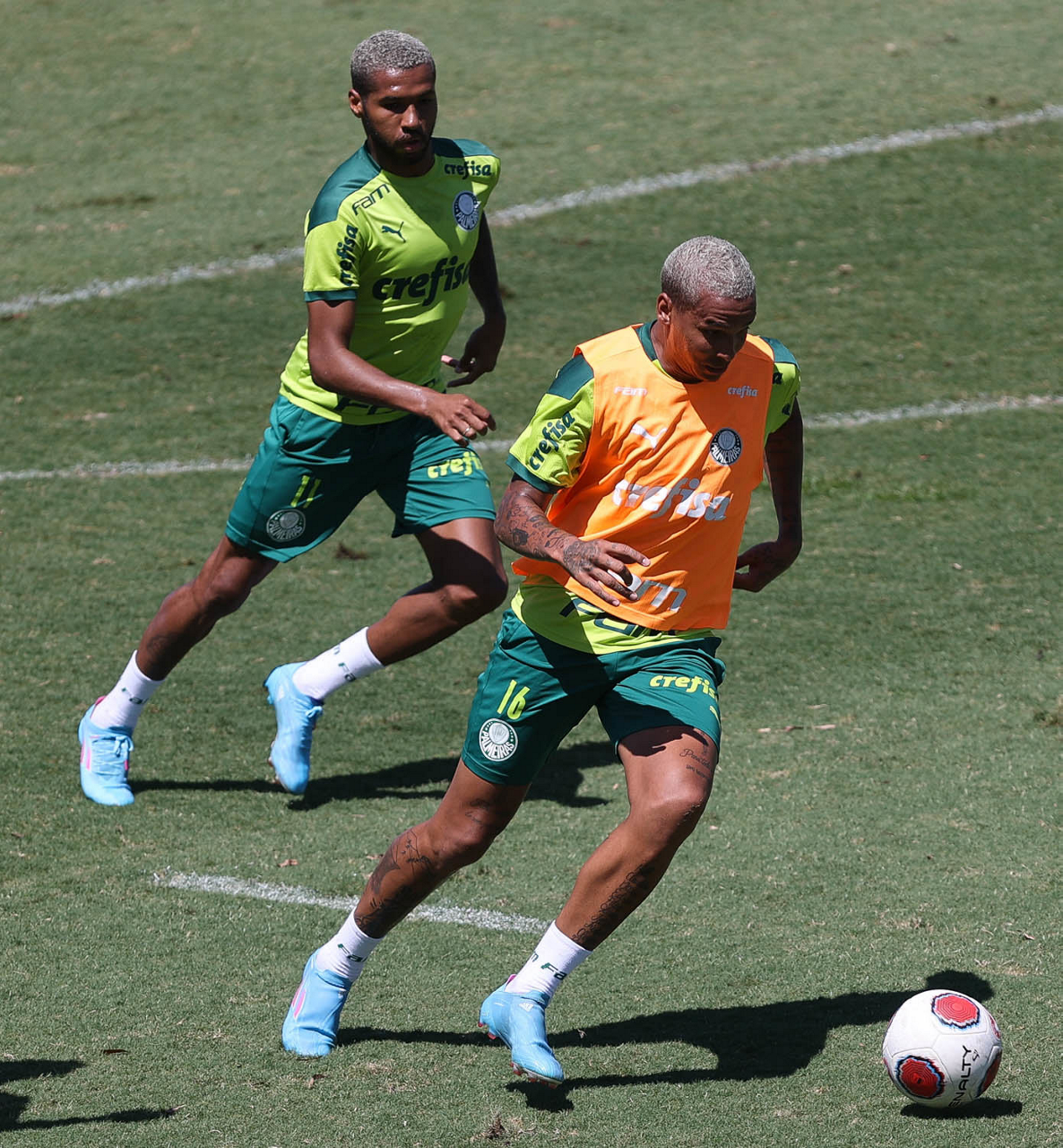 Os jogadores Eduard Atuesta e Deyverson (D), da SE Palmeiras, durante treinamento, na Academia de Futebol. (Foto: Cesar Greco)