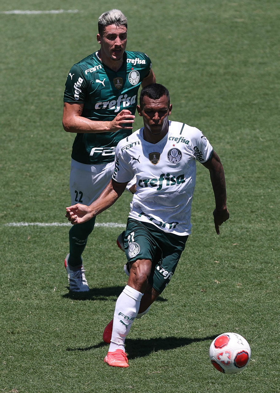 O goleiro Marcelo Lomba, os jogadores Benjamín Kuscevic, , Murilo, Wesley e Deyverson (E/D em pé) e Marcos Rocha, Jorge, Breno Lopes, Gabriel Menino, Eduard Atuesta, Gabriel Veron e Jailson (E/D agachados), da SE Palmeiras, durante jogo-treino, na Academia de Futebol. (Foto: Cesar Greco)