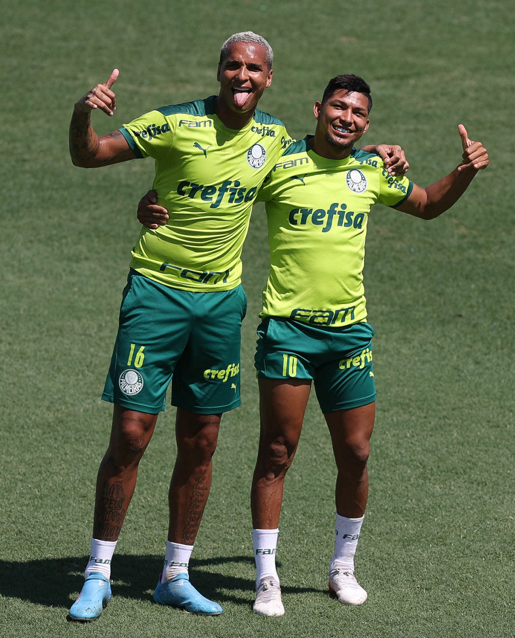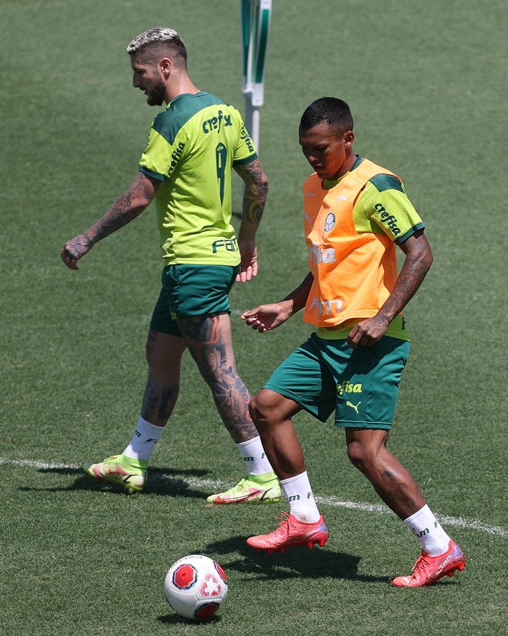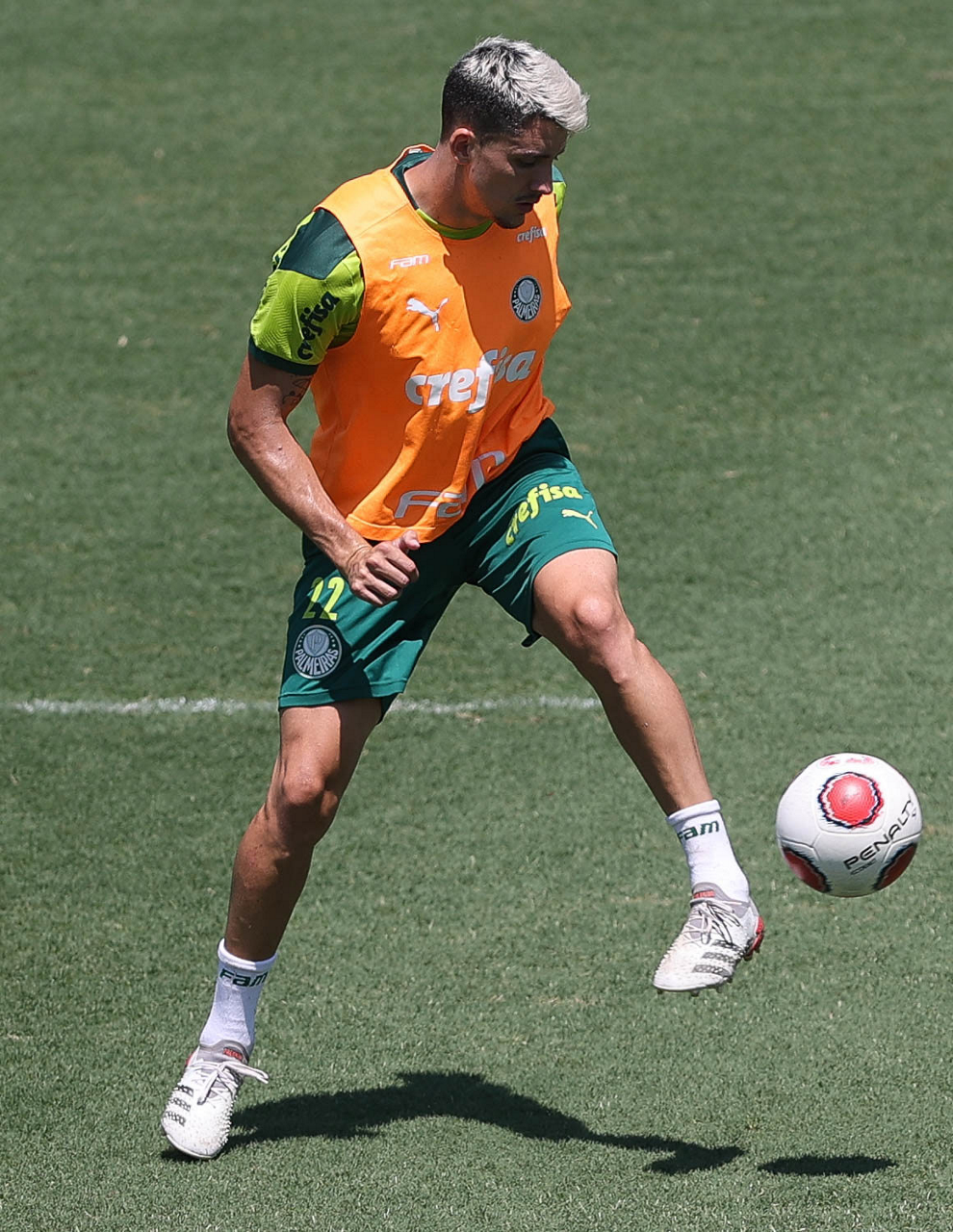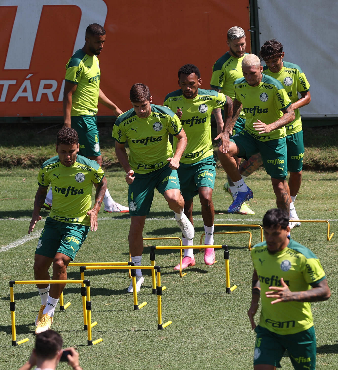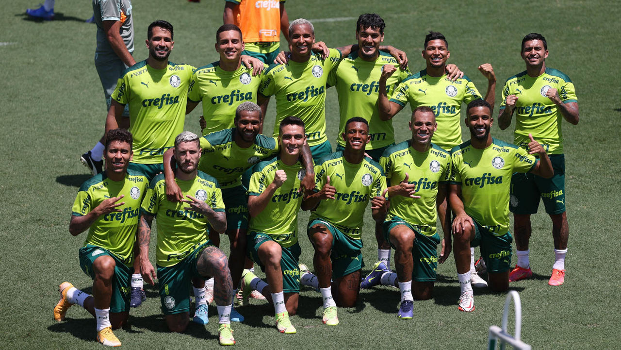 Os jogadores Luan, Renan, Deyverson, Gustavo Gómez, Rony e Dudu (E/D em pé) e Marcos Rocha, Zé Rafael, Wesley, Eduard Atuesta, Danilo, Breno Lopes e Jorge (E/D agachados), da SE Palmeiras, durante treinamento, na Academia de Futebol. (Foto: Cesar Greco)