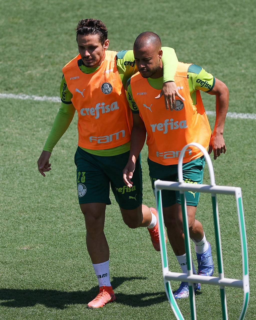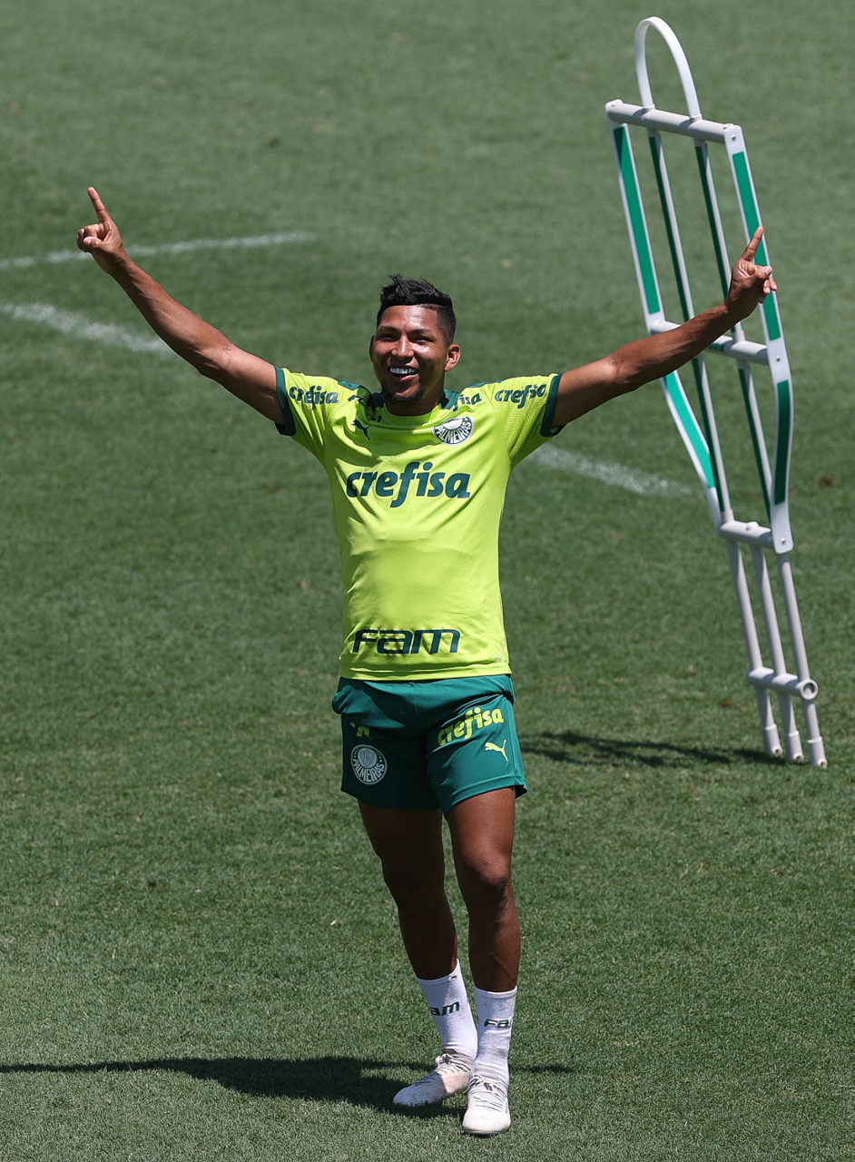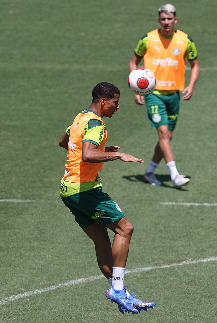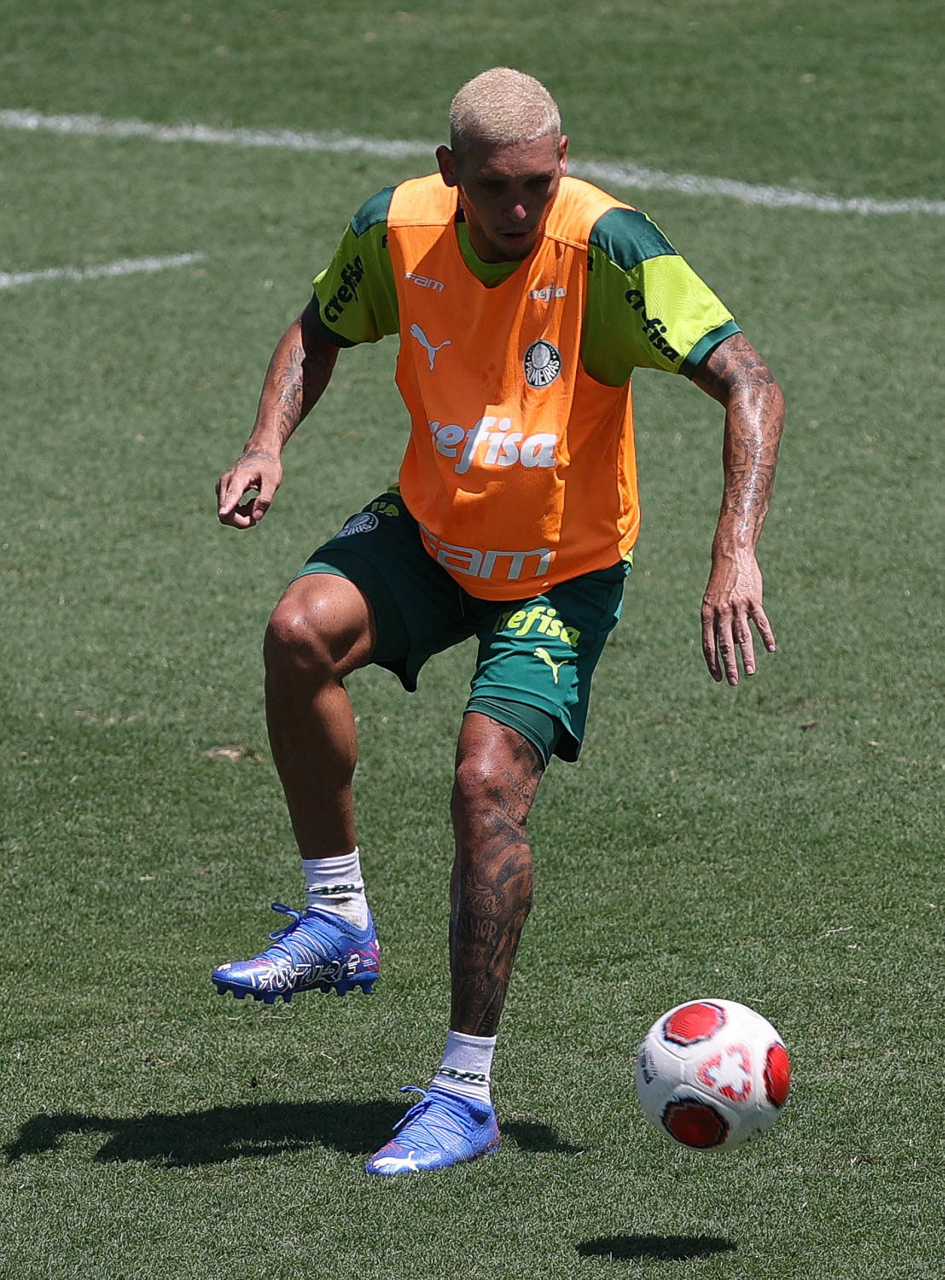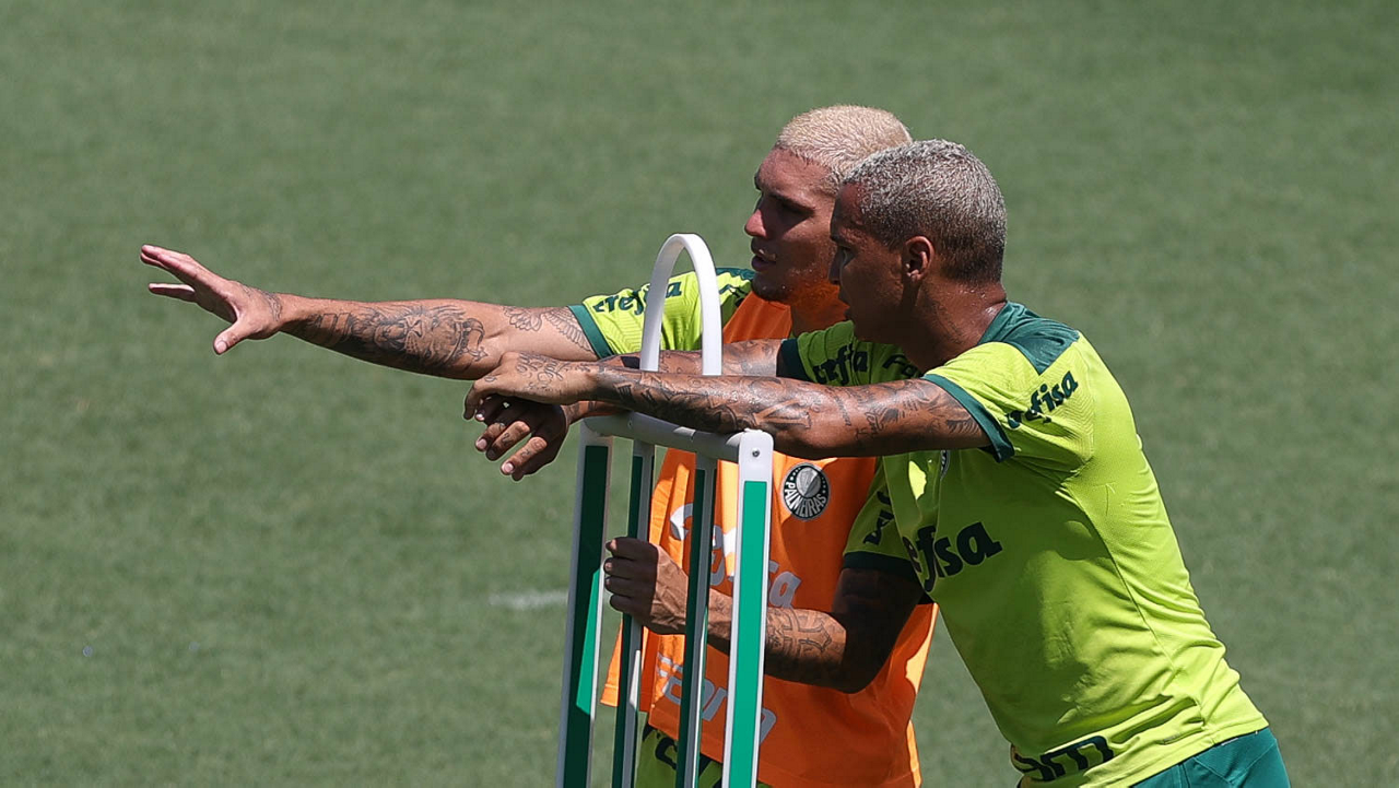 Os jogadores Luan, Renan, Deyverson, Gustavo Gómez, Rony e Dudu (E/D em pé) e Marcos Rocha, Zé Rafael, Wesley, Eduard Atuesta, Danilo, Breno Lopes e Jorge (E/D agachados), da SE Palmeiras, durante treinamento, na Academia de Futebol. (Foto: Cesar Greco)
