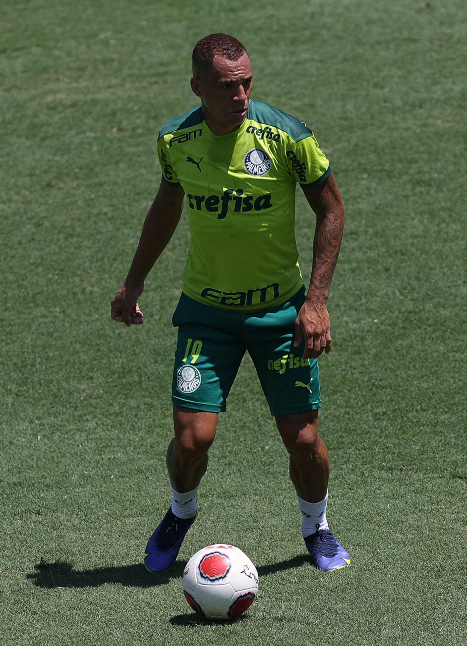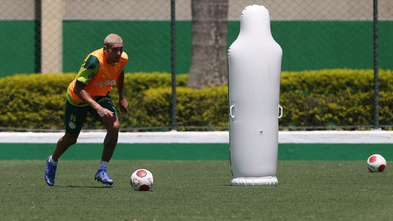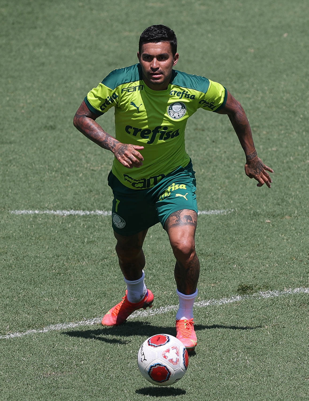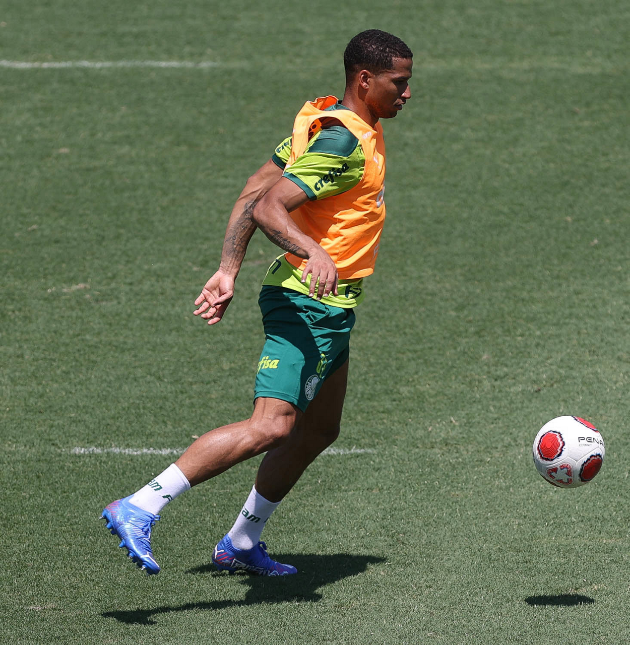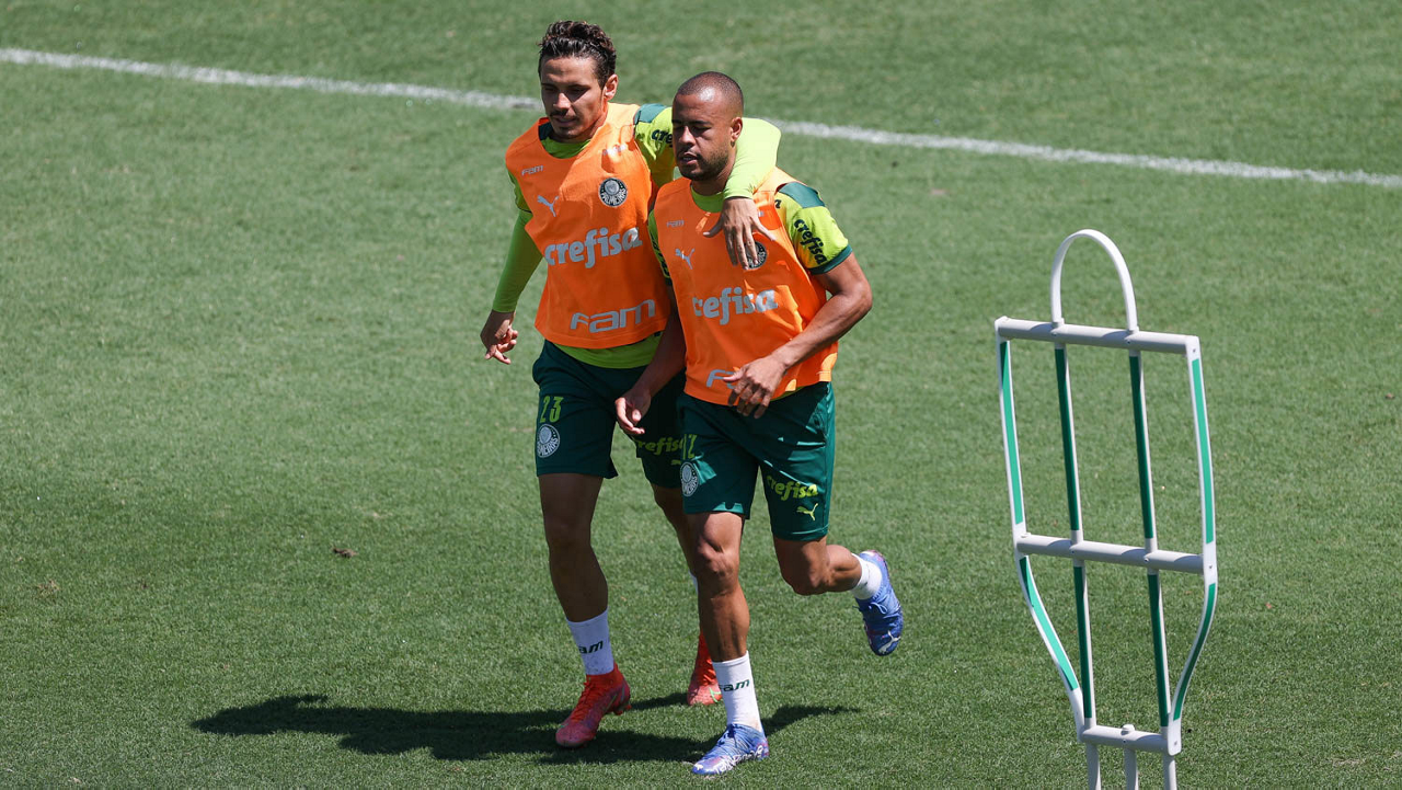 Os jogadores Luan, Renan, Deyverson, Gustavo Gómez, Rony e Dudu (E/D em pé) e Marcos Rocha, Zé Rafael, Wesley, Eduard Atuesta, Danilo, Breno Lopes e Jorge (E/D agachados), da SE Palmeiras, durante treinamento, na Academia de Futebol. (Foto: Cesar Greco)